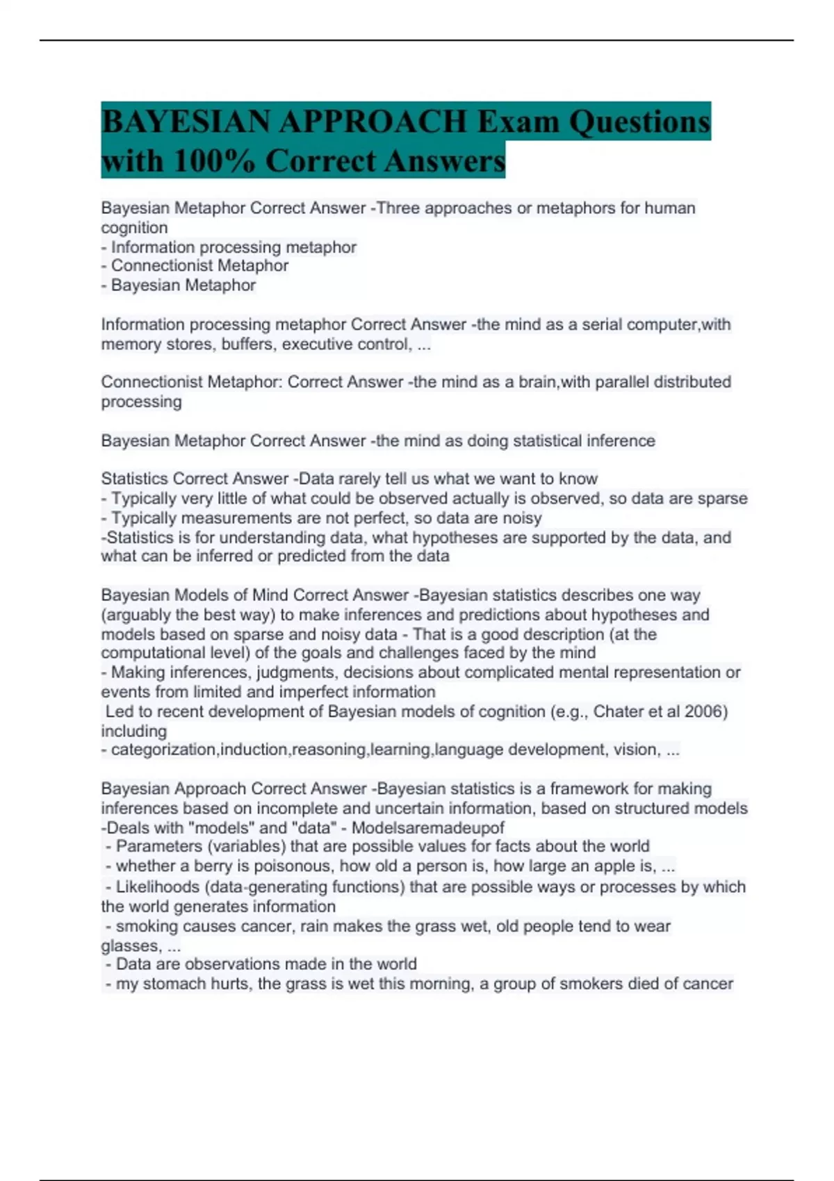Bayesian Metaphor Correct Answer -Three approaches or metaphors for human cognition - Information processing metaphor - Connectionist Metaphor - Bayesian Metaphor Information processing metaphor Correct Answer -the mind as a serial computer,with memory stores, buffers, executive control, ... Connectionist Metaphor: Correct Answer -the mind as a brain,with parallel distributed processing Bayesian Metaphor Correct Answer -the mind as doing statistical inference Statistics Correct Answer -Data rarely tell us what we want to know - Typically very little of what could be observed actually is observed, so data are sparse - Typically measurements are not perfect, so data are noisy -Statistics is for understanding data, what hypotheses are supported by the data, and what can be inferred or predicted from the data Bayesian Models of Mind Correct Answer -Bayesian statistics describes one way (arguably the best way) to make inferences and predictions about hypotheses and models based on sparse and noisy data - That is a good description (at the computational level) of the goals and challenges faced by the mind - Making inferences, judgments, decisions about complicated mental representation or events from limited and imperfect information Led to recent development of Bayesian models of cognition (e.g., Chater et al 2006) including - categorization,induction,reasoning,learning,language development, vision, ... Bayesian Approach Correct Answer -Bayesian statistics is a framework for making inferences based on incomplete and uncertain information, based on structured models -Deals with "models" and "data" - Modelsaremadeupof - Parameters (variables) that are possible values for facts about the world - whether a berry is poisonous, how old a person is, how large an apple is, ... - Likelihoods (data‐generating functions) that are possible ways or processes by which the world generates information - smoking causes cancer, rain makes the grass wet, old people tend to wear glasses, ... - Data are observations made in the world - my stomach hurts, the grass is wet this morning, a group of smokers died of cancer