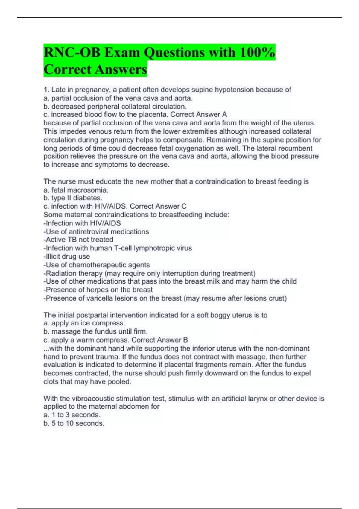 1. Late in pregnancy, a patient often develops supine hypotension because of a. partial occlusion of the vena cava and aorta. b. decreased peripheral collateral circulation. c. increased blood flow to the placenta. Correct Answer A because of partial occlusion of the vena cava and aorta from the weight of the uterus. This impedes venous return from the lower extremities although increased collateral circulation during pregnancy helps to compensate. Remaining in the supine position for long periods of time could decrease fetal oxygenation as well. The lateral recumbent position relieves the pressure on the vena cava and aorta, allowing the blood pressure to increase and symptoms to decrease. The nurse must educate the new mother that a contraindication to breast feeding is a. fetal macrosomia. b. type II diabetes. c. infection with HIV/AIDS. Correct Answer C Some maternal contraindications to breastfeeding include: -Infection with HIV/AIDS -Use of antiretroviral medications -Active TB not treated -Infection with human T-cell lymphotropic virus -Illicit drug use -Use of chemotherapeutic agents -Radiation therapy (may require only interruption during treatment) -Use of other medications that pass into the breast milk and may harm the child -Presence of herpes on the breast -Presence of varicella lesions on the breast (may resume after lesions crust) The initial postpartal intervention indicated for a soft boggy uterus is to a. apply an ice compress. b. massage the fundus until firm. c. apply a warm compress. Correct Answer B ...with the dominant hand while supporting the inferior uterus with the non-dominant hand to prevent trauma. If the fundus does not contract with massage, then further evaluation is indicated to determine if placental fragments remain. After the fundus becomes contracted, the nurse should push firmly downward on the fundus to expel clots that may have pooled. With the vibroacoustic stimulation test, stimulus with an artificial larynx or other device is applied to the maternal abdomen for a. 1 to 3 seconds. b. 5 to 10 seconds. c. 1 to 2 minutes. Correct Answer A Usually, stimulus is applied for 1-2 seconds and repeated up to 3 times with time extending to 3 seconds in order to stimulate fetal movement. A positive or reactive finding is an increased fetal heart rate of 15 bpm or more for at least 15 seconds; however, a nonreactive result does not always indicate fetal abnormality but indicates the need for further testing. Absence of the Moro reflex on one side only in a neonate may indicate a. fractured scapula. b. cerebral palsy. c. fractured clavicle. Correct Answer C a fractured clavicle or brachial plexus injury. Damage to the central nervous system, such as may occur with cerebral palsy, often results in bilateral absence of the reflex. The Moro reflex is elicited by allowing the infant's head and trunk to fall slightly backward when the infant is raised. A positive Moro reflex includes immediate extension and abduction of the arms(and sometimes the legs) with fingers fanning and forming a C-shape with a return of the limbs to the flexed states In a multiparous woman, what is the lowest Bishop score that predicts labor induction will be successful? a. 5 b. 7 c. 9 Correct Answer A In a multiparous woman, the Bishop score that predicts that labor induction will be successful is 5 or more while it is a 9 or more for a nulliparous woman. The Bishop score is a rating system to determine readiness for induction based on scores of 0-3 in four different measures: dilation (cm), effacement (percentage), station (cm), and cervical consistency (firm, medium, soft), and cervical position (posterior, mid position, anterior). The fifth measure, cervical position, is scored only 0-2. When cervical laceration occur during delivery, they are most common at what position? a. 3 and 9 o'clock b. 12 and 6 o'clock c. 10 and 4 o'clock Correct Answer A Cervical lacerations are most often identified with vaginal retractors when bleeding is persistent after delivery. The lacerations are sutured with absorbable sutures, so no further treatment is usually indicated. Minor lacerations often occur during delivery, but they usually require no treatment. Tears are more common after forceps assisted and vacuum assisted deliveries than normal vaginal births If using fetal pulse oximetry, what is normal oxygen saturation? a. 30% to 65% b. 65% to 90% c. 90% to 100% Correct Answer A because of the fetus's high hemoglobin and hematocrit. A value below 30% may be associated with hypoxia and metabolic acidosis. For fetal pulse oximetry, which may be