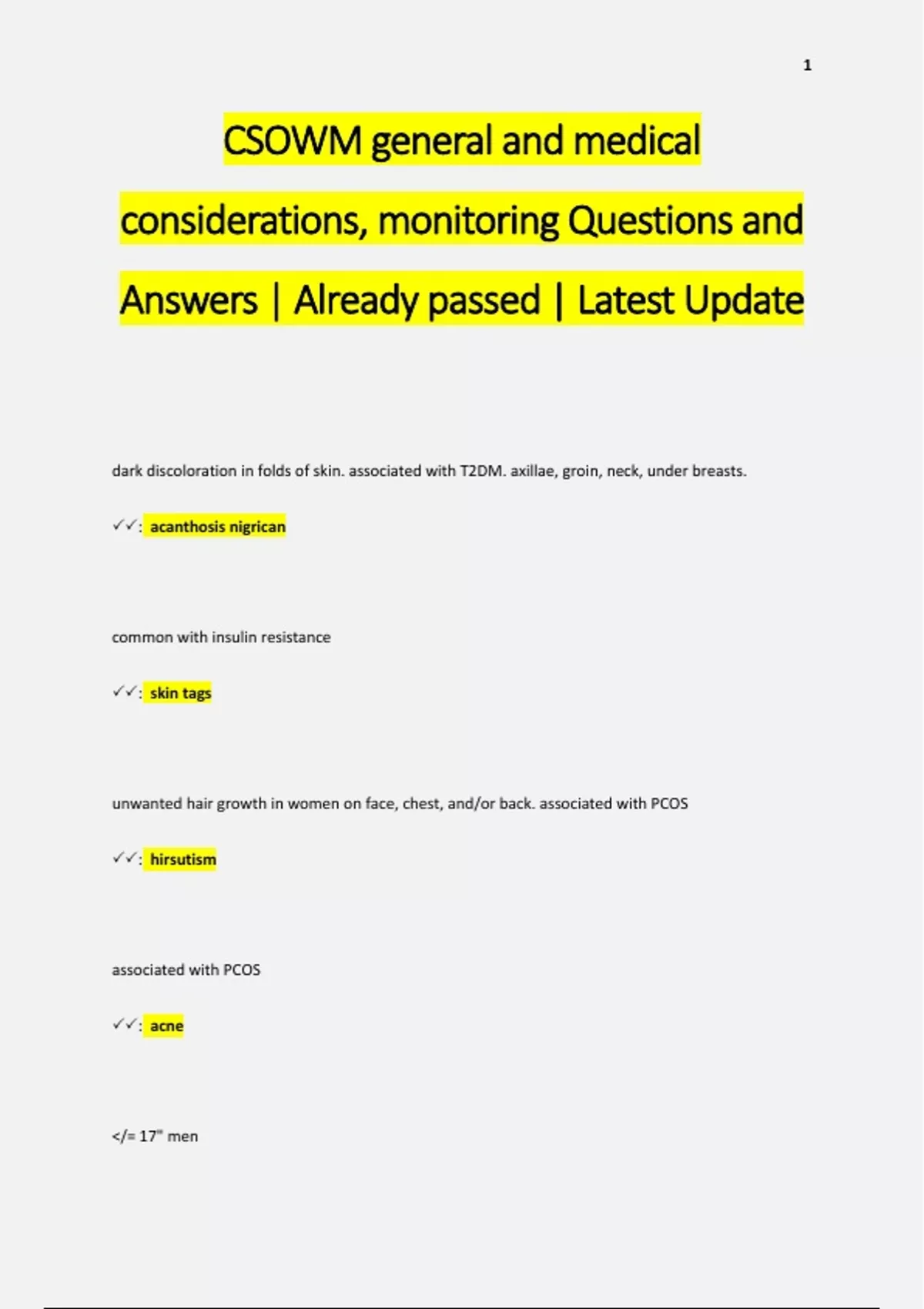 dark discoloration in folds of skin. associated with T2DM. axillae, groin, neck, under breasts. : acanthosis nigrican common with insulin resistance : skin tags unwanted hair growth in women on face, chest, and/or back. associated with PCOS : hirsutism associated with PCOS : acne </= 17" me