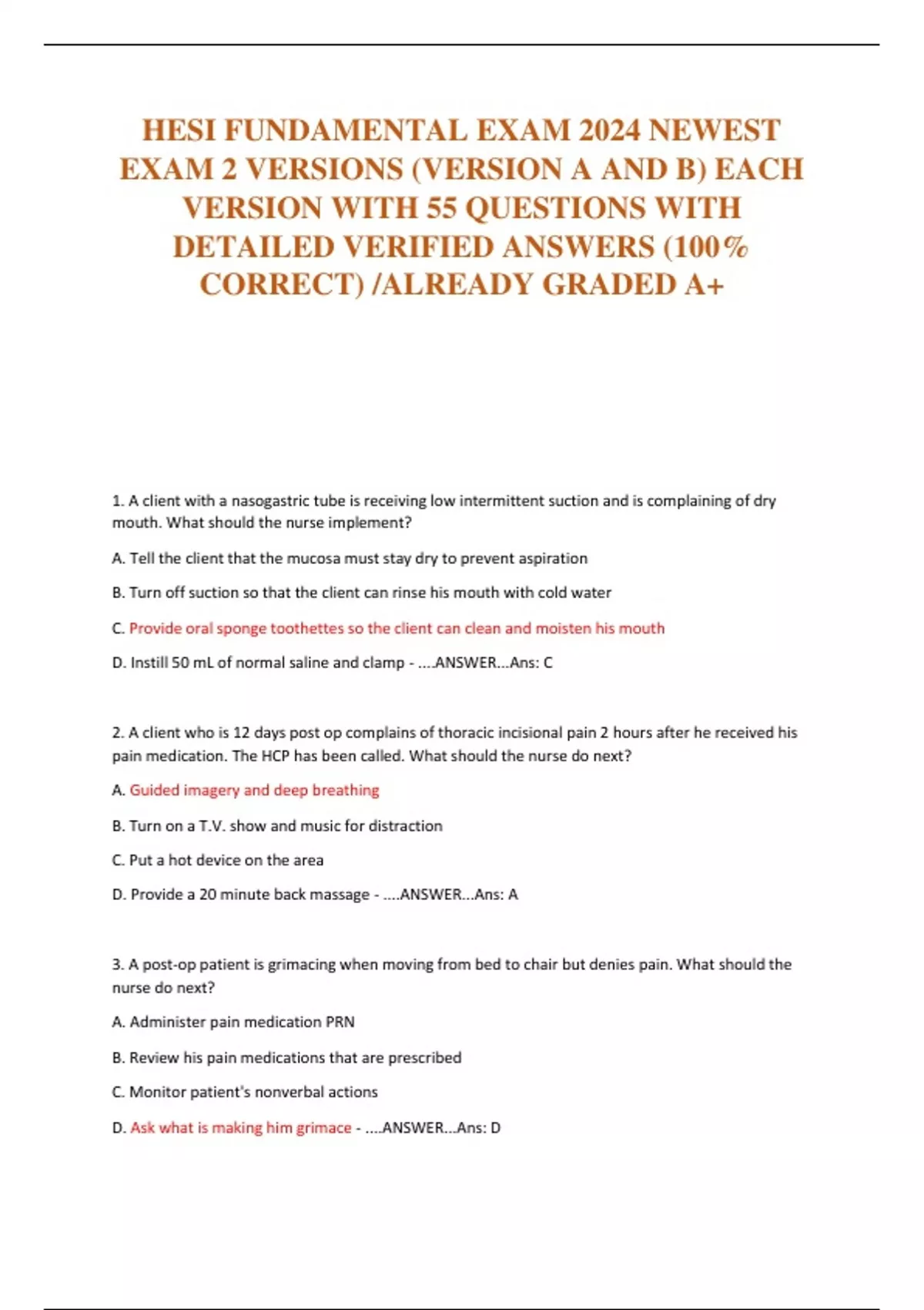 HESI FUNDAMENTAL EXAM 2024 NEWEST EXAM 2 VERSIONS (VERSION A AND B) EACH VERSION WITH 55 QUESTIONS WITH DETAILED VERIFIED ANSWERS (100% CORRECT) /ALREADY GRADED A+