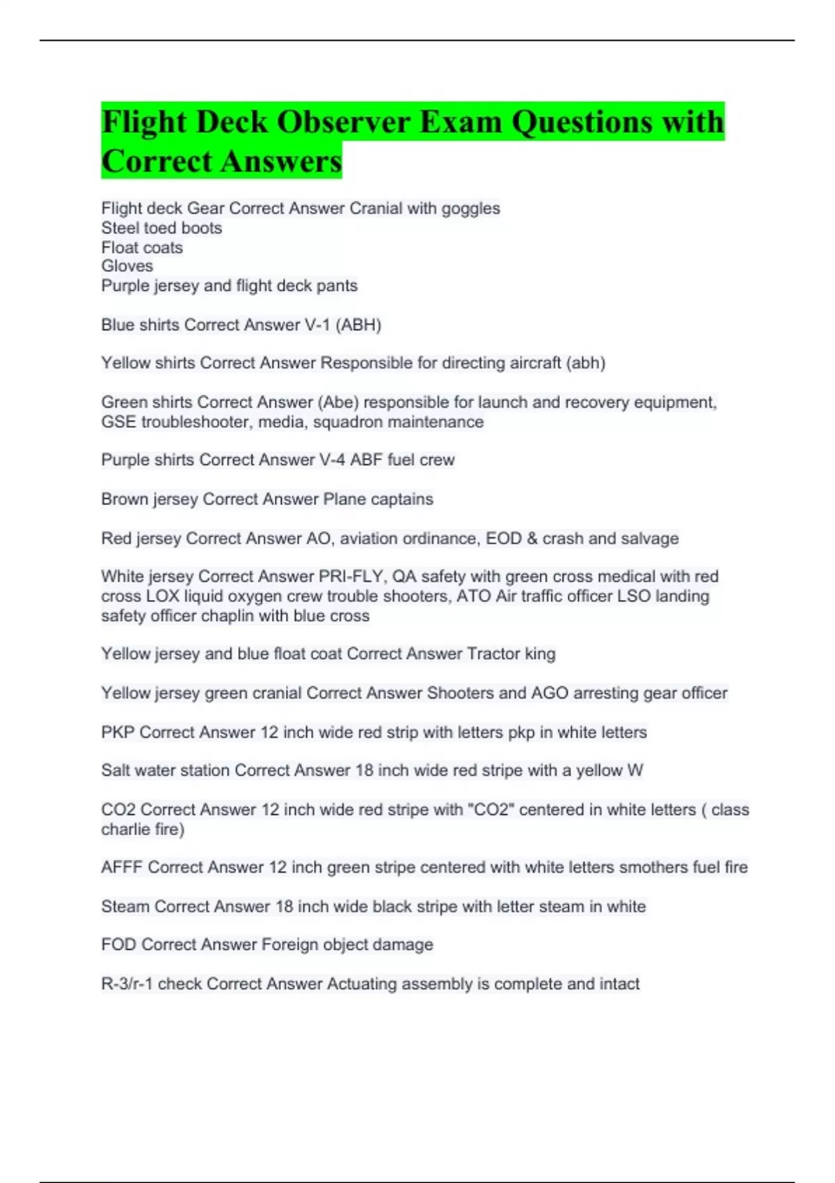 Flight deck Gear Correct Answer Cranial with goggles Steel toed boots Float coats Gloves Purple jersey and flight deck pants Blue shirts Correct Answer V-1 (ABH) Yellow shirts Correct Answer Responsible for directing aircraft (abh) Green shirts Correct Answer (Abe) responsible for launch and recovery equipment, GSE troubleshooter, media, squadron maintenance Purple shirts Correct Answer V-4 ABF fuel crew Brown jersey Correct Answer Plane captains Red jersey Correct Answer AO, aviation ordinance, EOD & crash and salvage White jersey Correct Answer PRI-FLY, QA safety with green cross medical with red cross LOX liquid oxygen crew trouble shooters, ATO Air traffic officer LSO landing safety officer chaplin with blue cross Yellow jersey and blue float coat Correct Answer Tractor king Yellow jersey green cranial Correct Answer Shooters and AGO arresting gear officer PKP Correct Answer 12 inch wide red strip with letters pkp in white letters Salt water station Correct Answer 18 inch wide red stripe with a yellow W CO2 Correct Answer 12 inch wide red stripe with "CO2" centered in white letters ( class charlie fire)