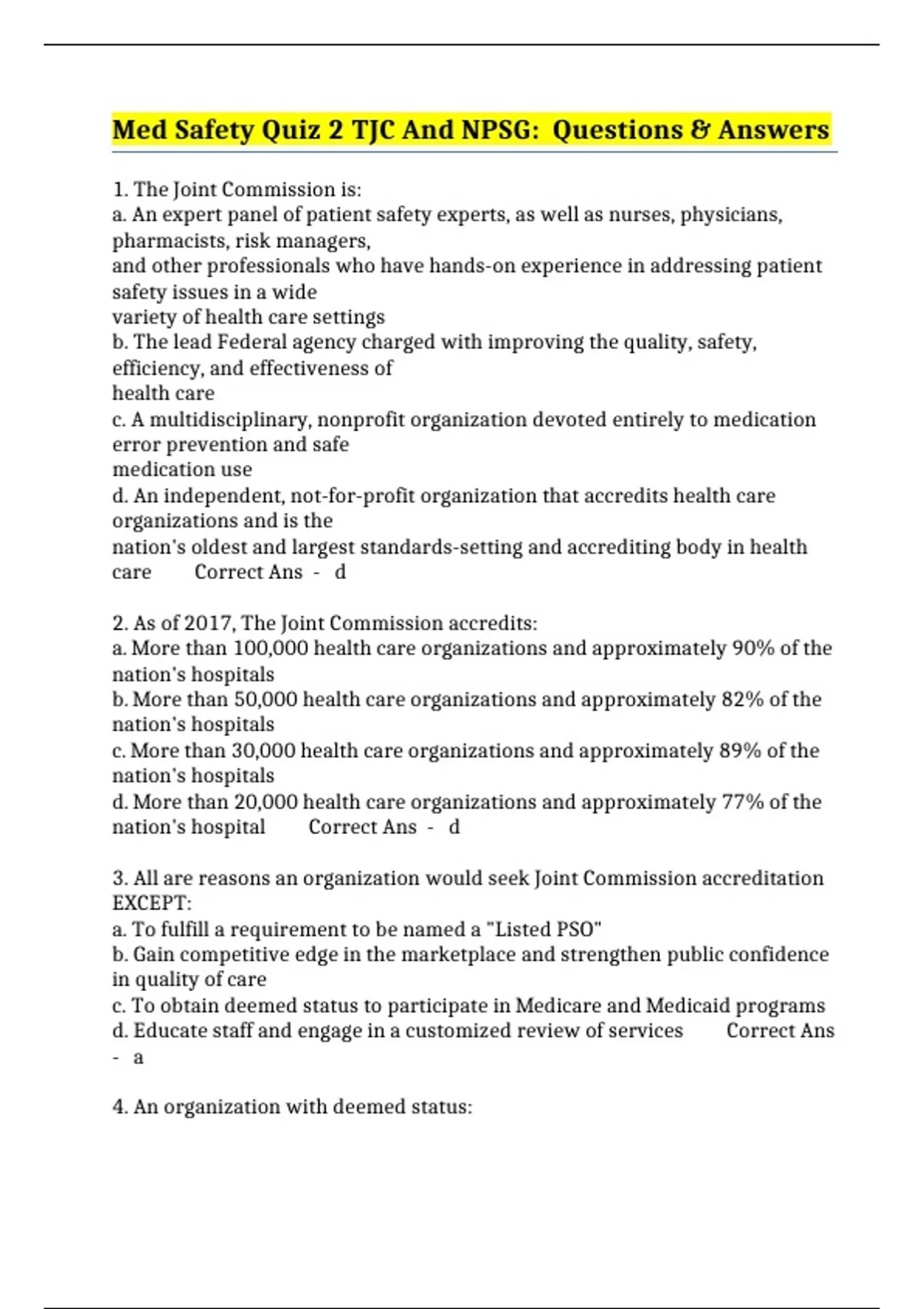 Med Safety Quiz 2 TJC And NPSG: Questions & Answers