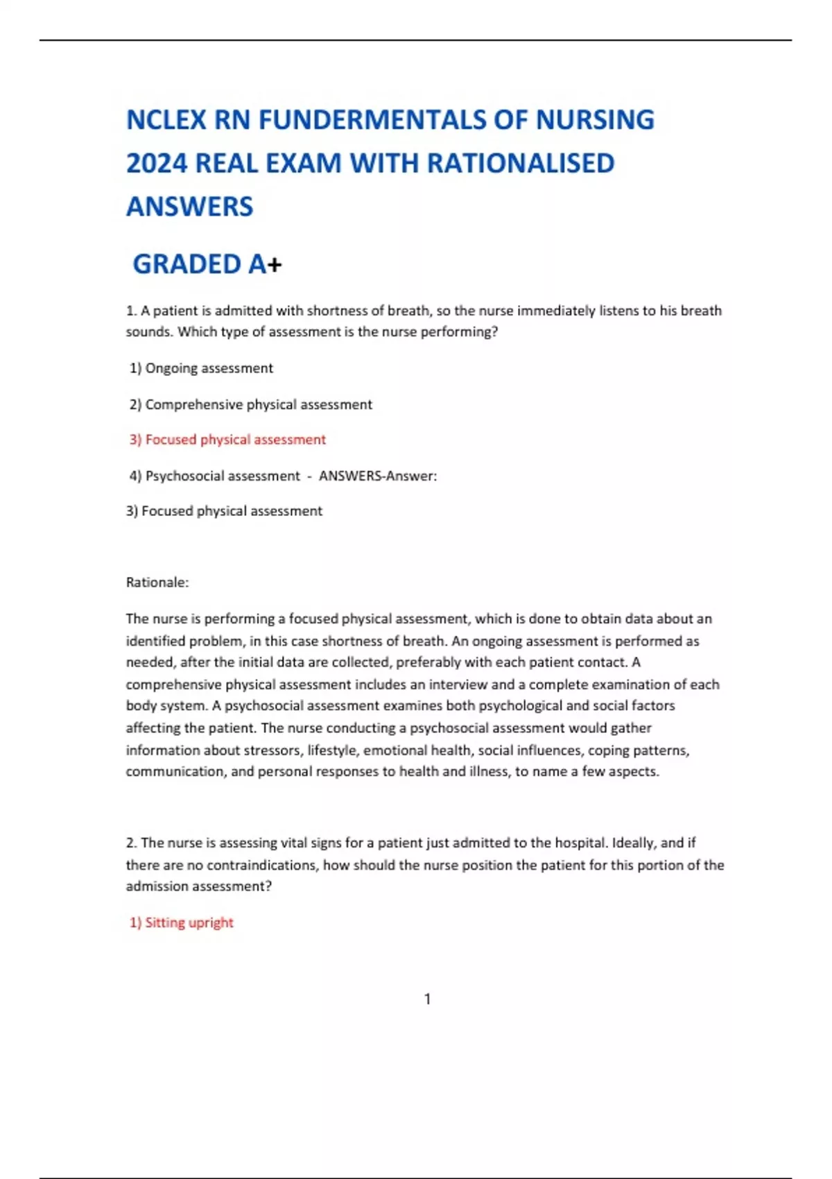 NCLEX RN FUNDERMENTALS OF NURSING 2024 REAL EXAM WITH RATIONALISED ANSWERS GRADED A+ 1. A patient is admitted with shortness of breath, so the nurse immediately listens to his breath sounds. Which type of assessment is the nurse performing? 1) Ongoing assessment 2) Comprehensive physical assessment 3) Focused physical assessment 4) Psychosocial assessment - ANSWERS-Answer: 3) Focused physical assessment Rationale: The nurse is performing a focused physical assessment, which is done to obtain data about an identified problem, in this case shortness of breath. An ongoing assessment is performed as needed, after the initial data are collected, preferably with each patient contact. A comprehensive physical assessment includes an interview and a complete examination of each body system. A psychosocial assessment examines both psychological and social factors affecting the patient. The nurse conducting a psychosocial assessment would gather information about stressors, lifestyle, emotional health, social influences, coping patterns, communication, and personal responses to health and illness, to name a few aspects. 2. The nurse is assessing vital signs for a patient just admitted to the hospital. Ideally, and if there are no contraindications, how should the nurse position the patient for this portion of the admission assessment? 1) Sitting upright 1 2) Lying flat on the back with knees flexed 3) Lying flat on the back with arms and legs fully extended 4) Side-lying with the knees flexed - ANSWERS-Answer: 1) Sitting upright Rationale: If the patient is able, the nurse should have the patient sit upright to obtain vital signs in order to allow the nurse to easily access the anterior and posterior chest for auscultation of heart and breath sounds. It allows for full lung expansion and is the preferred position for measuring blood pressure. Additionally, patients might be more comfortable and feel less vulnerable when sitting upright (rather than lying down on the back) and can have direct eye contact with the examiner. However, other positions can be suitable when the patient's physical condition restricts the comfort or ability of the patient to sit upright. 4.
