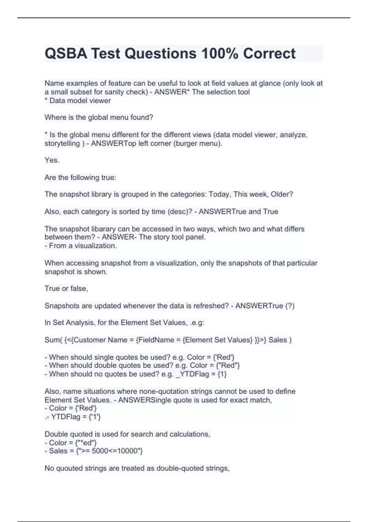 Name examples of feature can be useful to look at field values at glance (only look at a small subset for sanity check) - ANSWER* The selection tool * Data model viewer Where is the global menu found? * Is the global menu different for the different views (data model viewer, analyze, storytelling ) - ANSWERTop left corner (burger menu). Yes. Are the following true: The snapshot library is grouped in the categories: Today, This week, Older? Also, each category is sorted by time (desc)? - ANSWERTrue and True The snapshot libarary can be accessed in two ways, which two and what differs between them? - ANSWER- The story tool panel. - From a visualization. When accessing snapshot from a visualization, only the snapshots of that particular snapshot is shown. True or false, Snapshots are updated whenever the data is refreshed? - ANSWERTrue (?) In Set Analysis, for the Element Set Values, .e.g: Sum( {{Customer Name = {FieldName = {Element Set Values} }}} Sales )