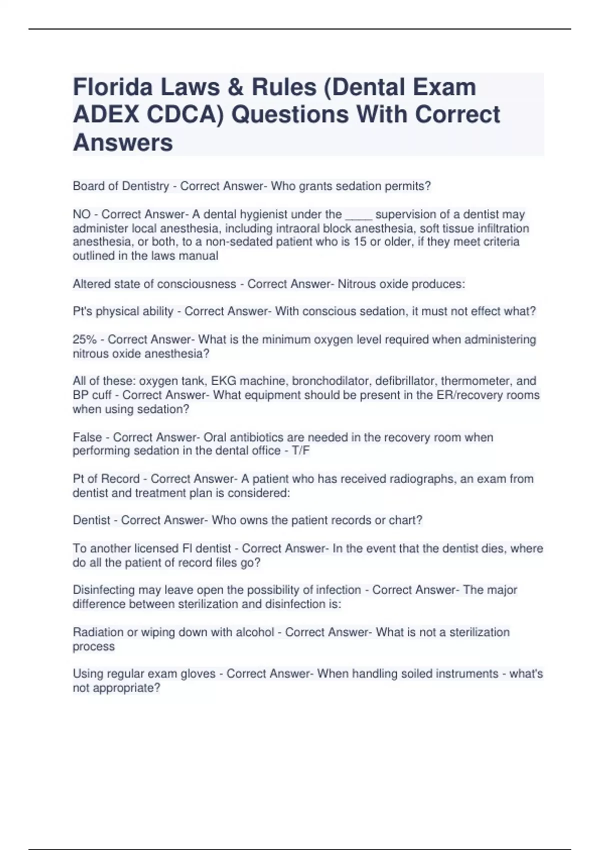Florida Laws & Rules (Dental Exam ADEX CDCA) Questions With Correct Answers