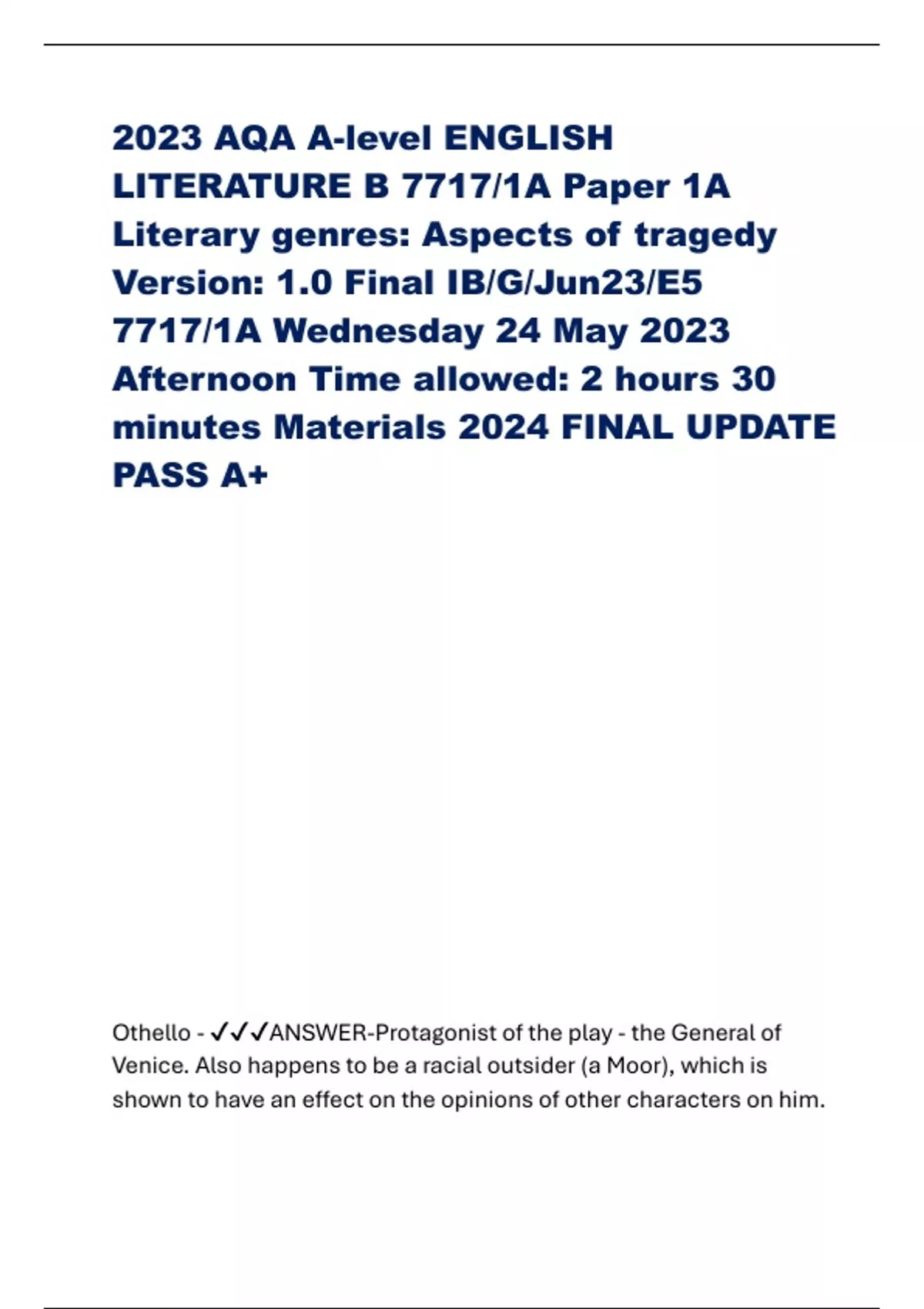2023 AQA A-level ENGLISH LITERATURE B 7717/1A Paper 1A Literary genres: Aspects of tragedy Version: 1.0 Final IB/G/Jun23/E5 7717/1A Wednesday 24 May 2023 Afternoon Time allowed: 2 hours 30 minutes Materials 2024 FINAL UPDATE PASS A+ Othello - ANSWER-Protagonist of the play - the General of Venice. Also happens to be a racial outsider (a Moor), which is shown to have an effect on the opinions of other characters on him.