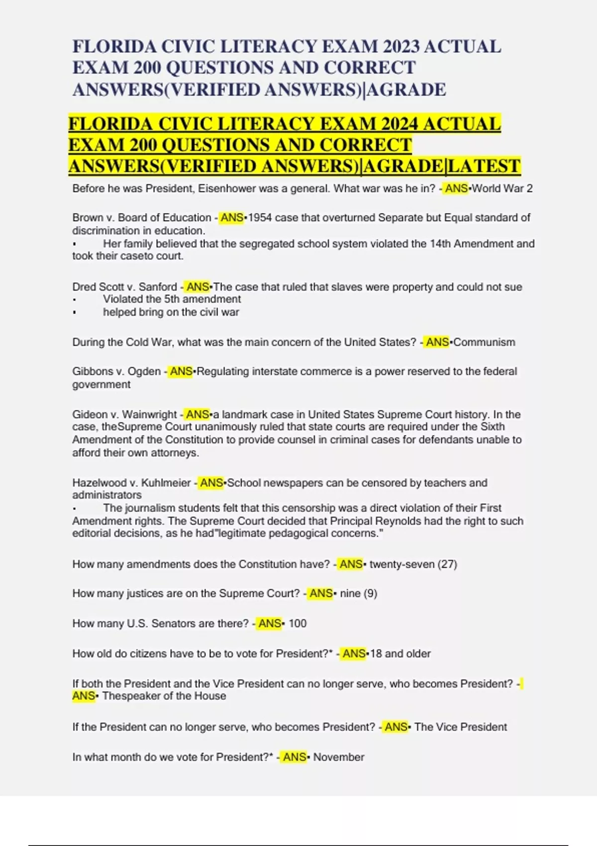 florida civic literacy exam 2024 actual exam 200 q