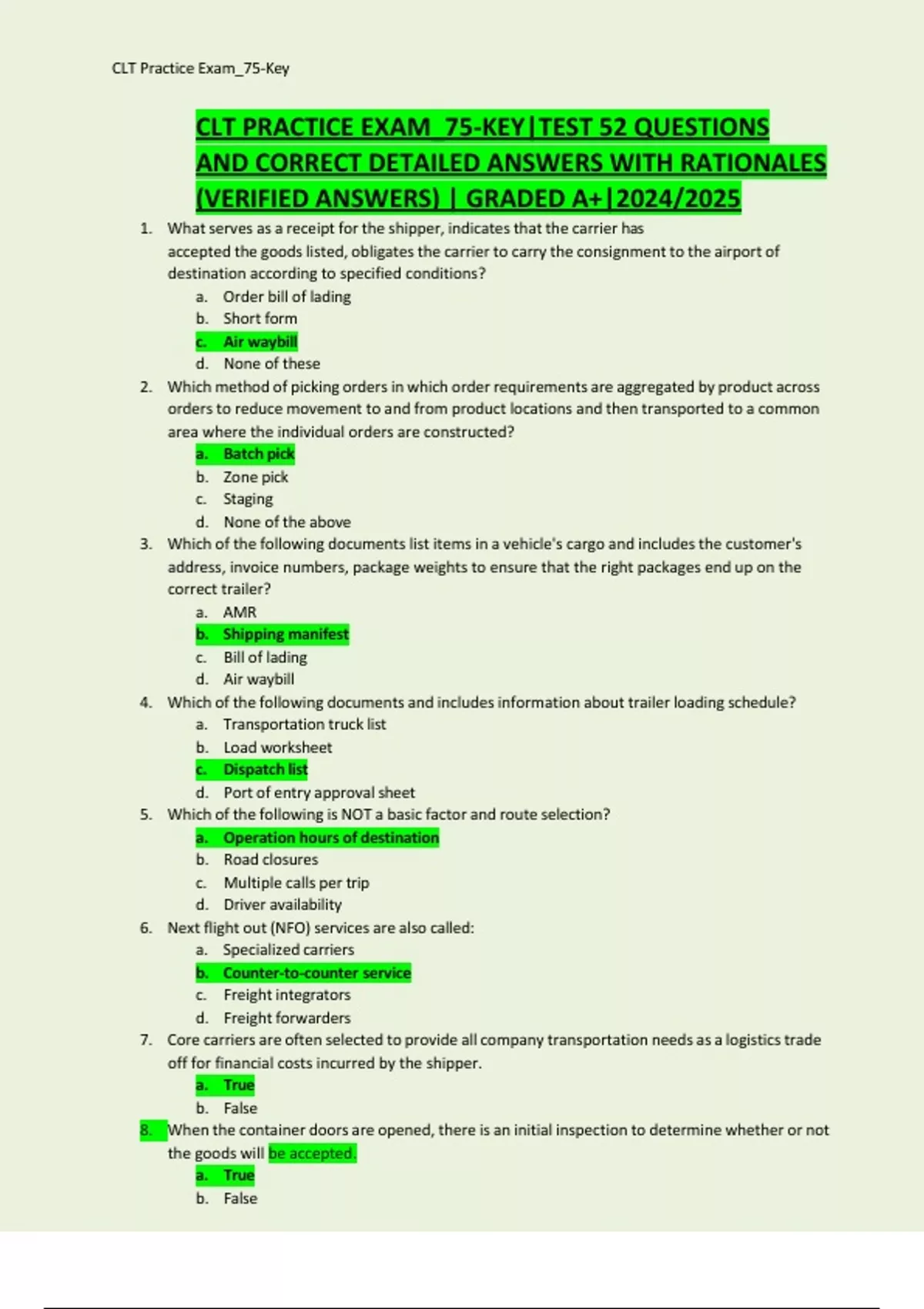 CLT PRACTICE EXAM_75-KEY|TEST 52 QUESTIONS AND CORRECT DETAILED ANSWERS WITH RATIONALES (VERIFIED ANSWERS) | GRADED A+|2024/2025