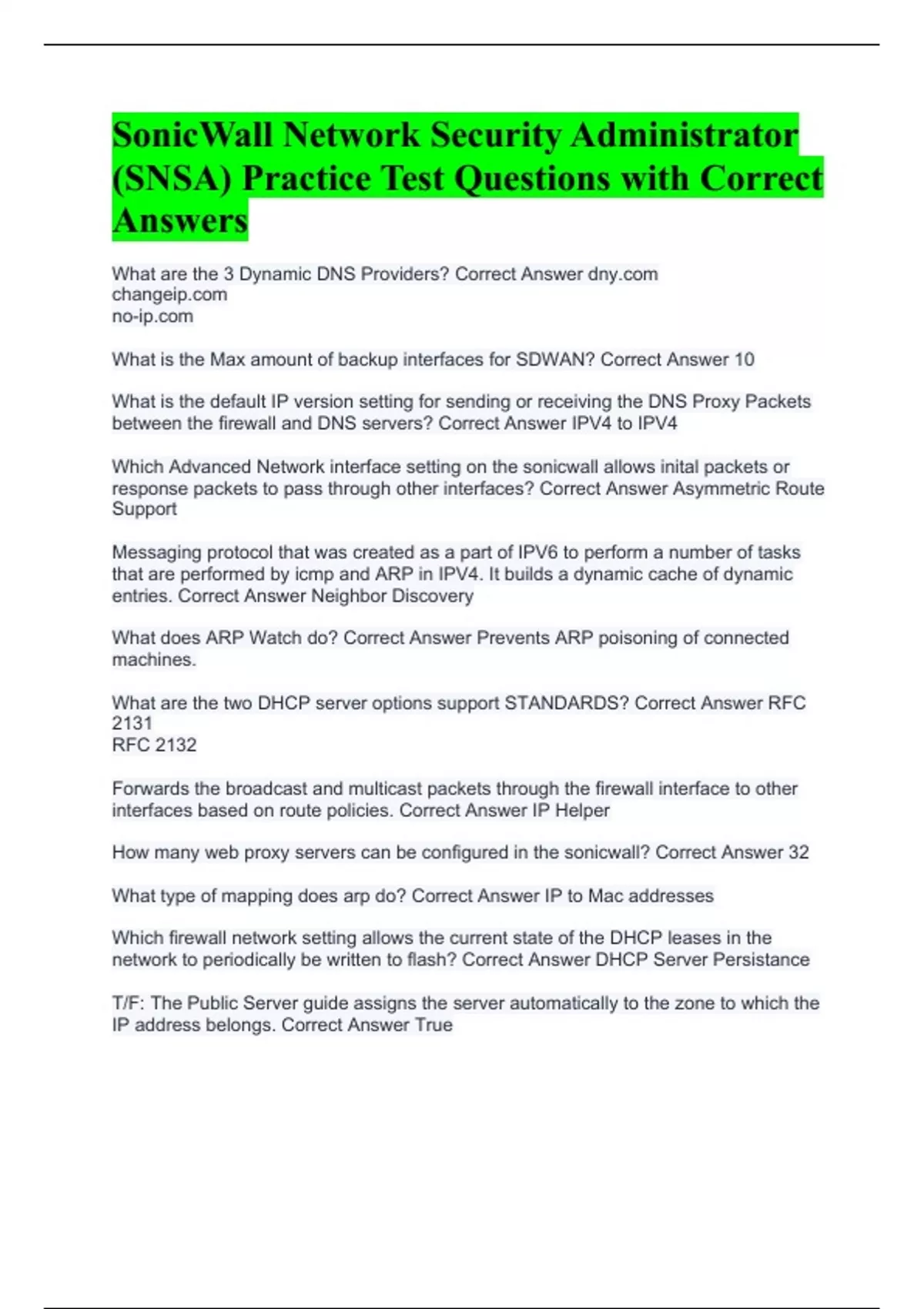 What are the 3 Dynamic DNS Providers? Correct Answer What is the Max amount of backup interfaces for SDWAN? Correct Answer 10 What is the default IP version setting for sending or receiving the DNS Proxy Packets between the firewall and DNS servers? Correct Answer IPV4 to IPV4 Which Advanced Network interface setting on the sonicwall allows inital packets or response packets to pass through other interfaces? Correct Answer Asymmetric Route Support Messaging protocol that was created as a part of IPV6 to perform a number of tasks that are performed by icmp and ARP in IPV4. It builds a dynamic cache of dynamic entries. Correct Answer Neighbor Discovery What does ARP Watch do? Correct Answer Prevents ARP poisoning of connected machines. What are the two DHCP server options support STANDARDS? Correct Answer RFC 2131 RFC 2132 Forwards the broadcast and multicast packets through the firewall interface to other interfaces based on route policies. Correct Answer IP Helper How many web proxy servers can be configured in the sonicwall? Correct Answer 32 What type of mapping does arp do? Correct Answer IP to Mac addresses Which firewall network setting allows the current state of the DHCP leases in the network to periodically be written to flash? Correct Answer DHCP Server Persistance T/F: The Public Server guide assigns the server automatically to the zone to which the IP address belongs. Correct Answer True