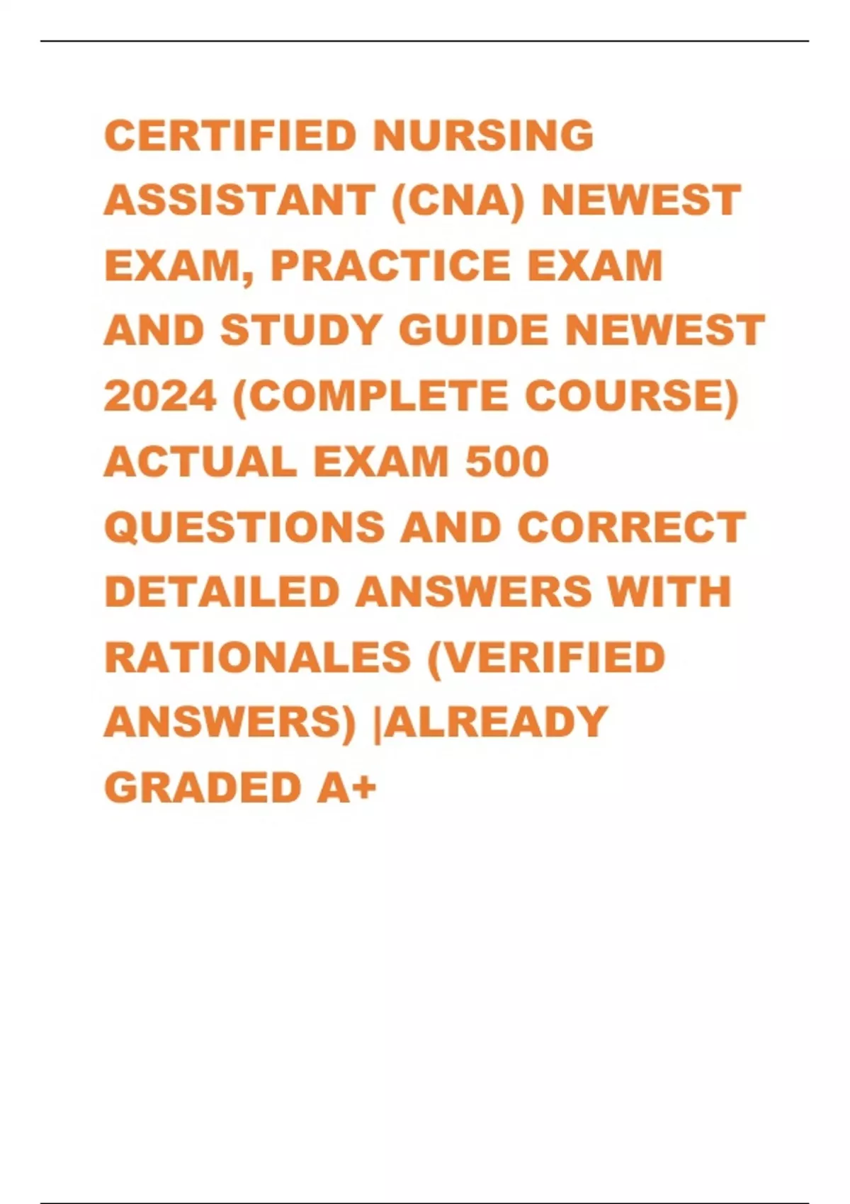 CERTIFIED NURSING ASSISTANT (CNA) NEWEST EXAM, PRACTICE EXAM AND STUDY GUIDE NEWEST 2024 (COMPLETE COURSE) ACTUAL EXAM 500 QUESTIONS AND CORRECT DETAILED ANSWERS WITH RATIONALES (VERIFIED ANSWERS) |ALREADY GRADED A+