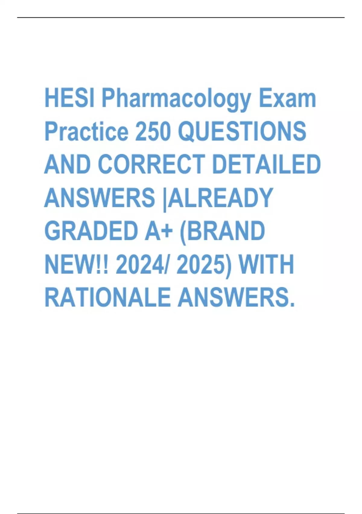 HESI Pharmacology Exam Practice 250 QUESTIONS AND CORRECT DETAILED ANSWERS |ALREADY GRADED A+ (BRAND NEW!! 2024/ 2025) WITH RATIONALE ANSWERS.