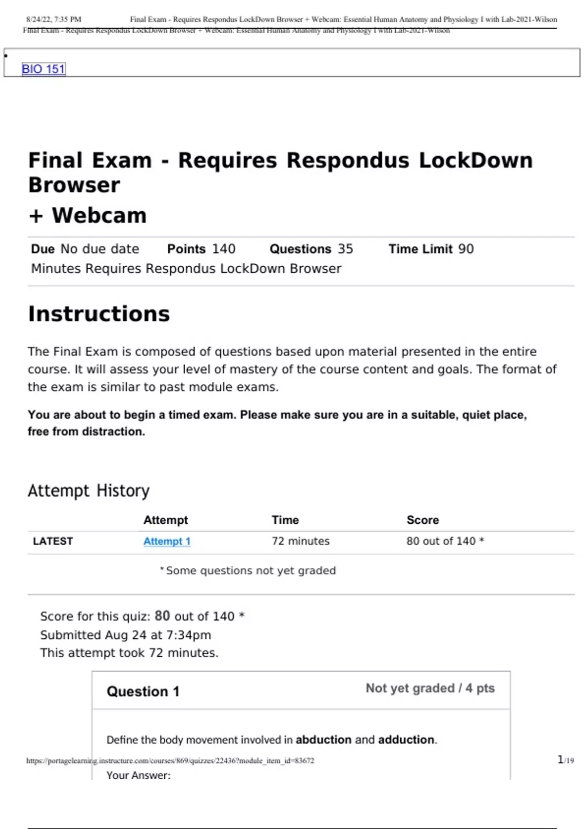 • BIO 151 Final Exam - Requires Respondus LockDown Browser + Webcam Due No due date Points 140 Questions 35 Time Limit 90 Minutes Requires Respondus LockDown Browser Instructions The Final Exam is composed of questions based upon material presented in the entire course. It will assess your level of mastery of the course content and goals. The format of the exam is similar to past module exams. You are about to begin a timed exam. Please make sure you are in a suitable, quiet place, free from distraction. Attempt History Attempt Time Score LATEST Attempt 1 72 minutes 80 out of 140 * * Some questions not yet graded Score for this quiz: 80 out of 140 * Submitted Aug 24 at 7:34pm This attempt took 72 minutes.