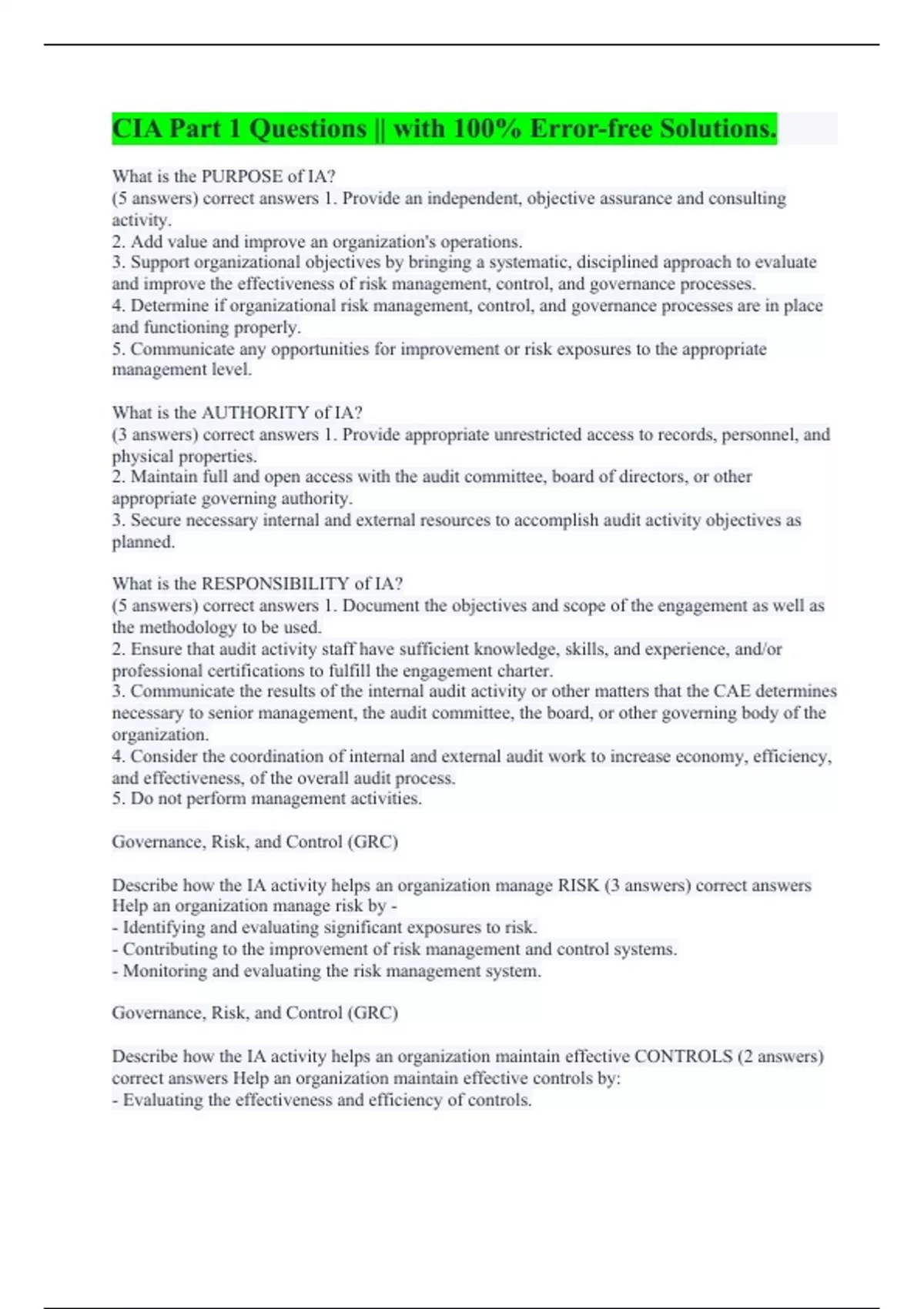 What is the PURPOSE of IA? (5 answers) correct answers 1. Provide an independent, objective assurance and consulting activity. 2. Add value and improve an organization's operations. 3. Support organizational objectives by bringing a systematic, disciplined approach to evaluate and improve the effectiveness of risk management, control, and governance processes. 4. Determine if organizational risk management, control, and governance processes are in place and functioning properly. 5. Communicate any opportunities for improvement or risk exposures to the appropriate management level. What is the AUTHORITY of IA? (3 answers) correct answers 1. Provide appropriate unrestricted access to records, personnel, and physical properties. 2. Maintain full and open access with the audit committee, board of directors, or other appropriate governing authority. 3. Secure necessary internal and external resources to accomplish audit activity objectives as planned. What is the RESPONSIBILITY of IA? (5 answers) correct answers 1. Document the objectives and scope of the engagement as well as the methodology to be used. 2. Ensure that audit activity staff have sufficient knowledge, skills, and experience, and/or professional certifications to fulfill the engagement charter. 3. Communicate the results of the internal audit activity or other matters that the CAE determines necessary to senior management, the audit committee, the board, or other governing body of the organization. 4. Consider the coordination of internal and external audit work to increase economy, efficiency, and effectiveness, of the overall audit process. 5. Do not perform management activities. Governance, Risk, and Control (GRC) Describe how the IA activity helps an organization manage RISK (3 answers) correct answers Help an organization manage risk by - - Identifying and evaluating significant exposures to risk. - Contributing to the improvement of risk management and control systems. - Monitoring and evaluating the risk management system. Governance, Risk, and Control (GRC) Describe how the IA activity helps an organization maintain effective CONTROLS (2 answers) correct answers Help an organization maintain effective controls by: - Evaluating the effectiveness and efficiency of controls.