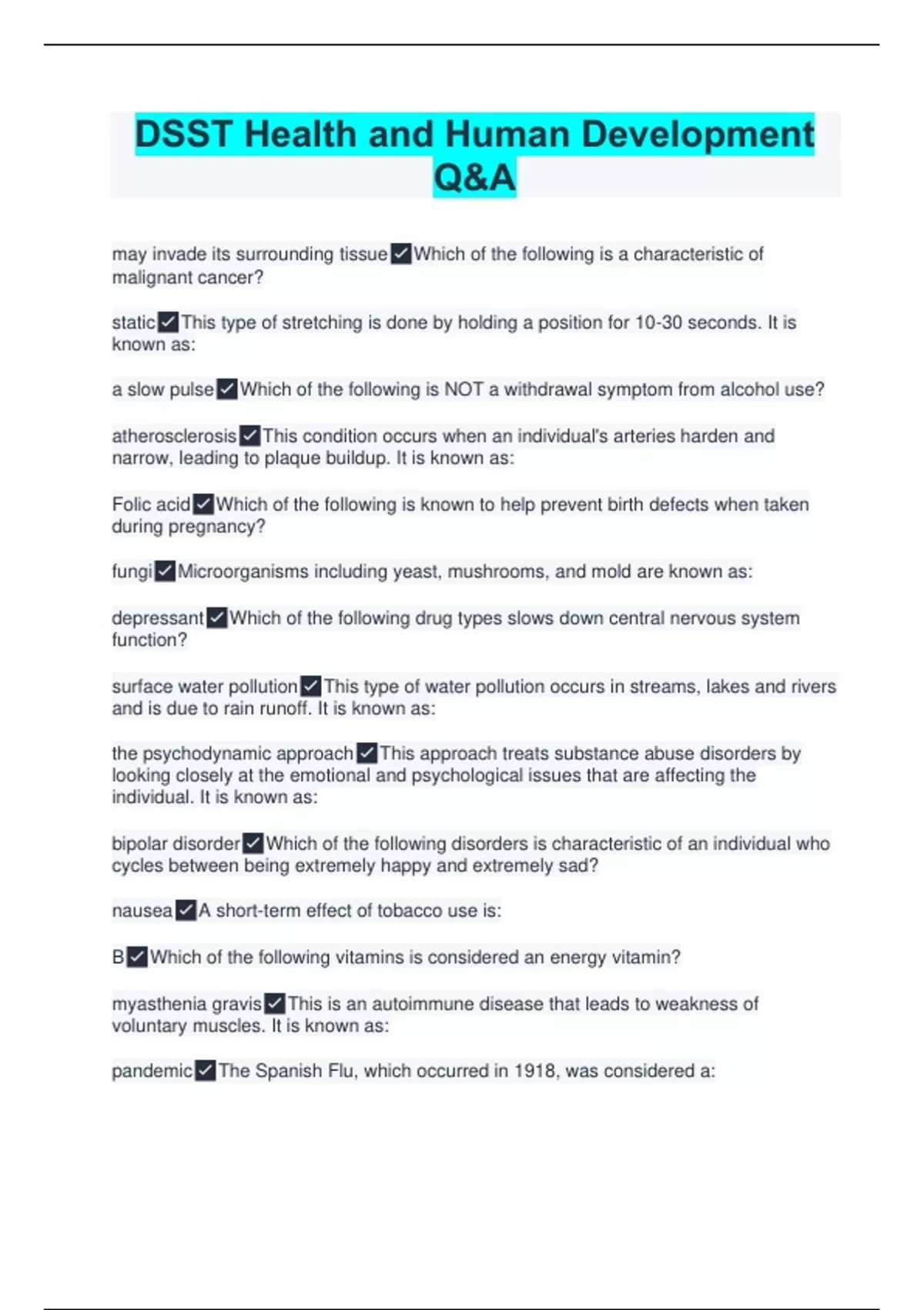 may invade its surrounding tissueWhich of the following is a characteristic of malignant cancer? staticThis type of stretching is done by holding a position for 10-30 seconds. It is known as: a slow pulseWhich of the following is NOT a withdrawal symptom from alcohol use? atherosclerosisThis condition occurs when an individual's arteries harden and narrow, leading to plaque buildup. It is known as: Folic acidWhich of the following is known to help prevent birth defects when taken during pregnancy? fungiMicroorganisms including yeast, mushrooms, and mold are known as: depressantWhich of the following drug types slows down central nervous system function? surface water pollutionThis type of water pollution occurs in streams, lakes and rivers and is due to rain runoff. It is known as: the psychodynamic approachThis approach treats substance abuse disorders by looking closely at the emotional and psychological issues that are affecting the individual. It is known as: bipolar disorderWhich of the following disorders is characteristic of an individual who cycles between being extremely happy and extremely sad? nauseaA short-term effect of tobacco use is: BWhich of the following vitamins is considered an energy vitamin? myasthenia gravisThis is an autoimmune disease that leads to weakness of voluntary muscles. It is known as: pandemicThe Spanish Flu, which occurred in 1918, was considered a: