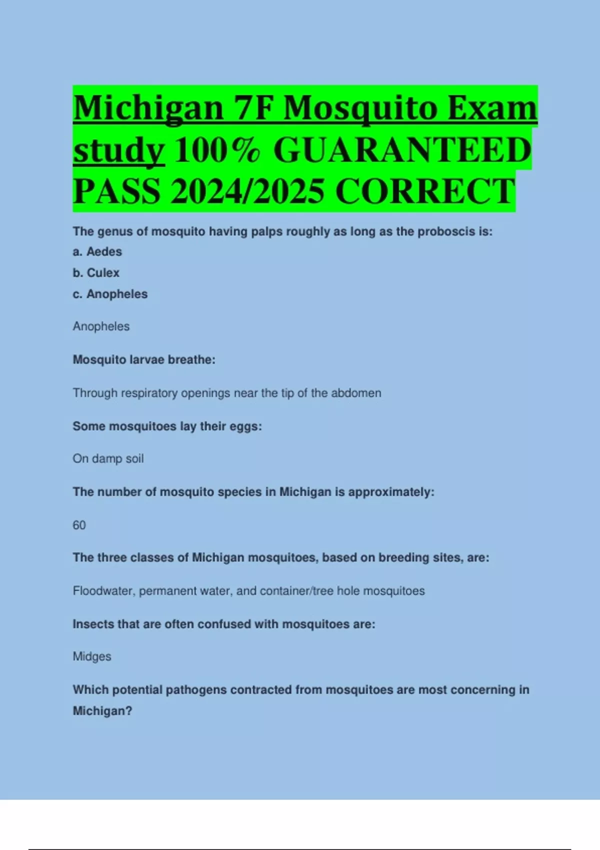 Michigan 7F Mosquito Exam study 100% GUARANTEED PASS 2024/2025 CORRECT