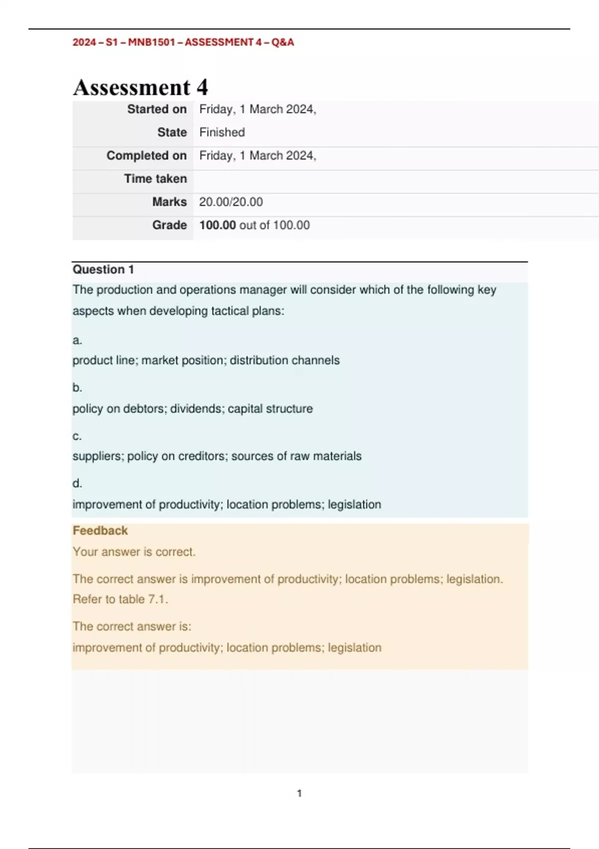 , 2024 – S1 – MNB1501 – ASSESSMENT 4 – Q&A