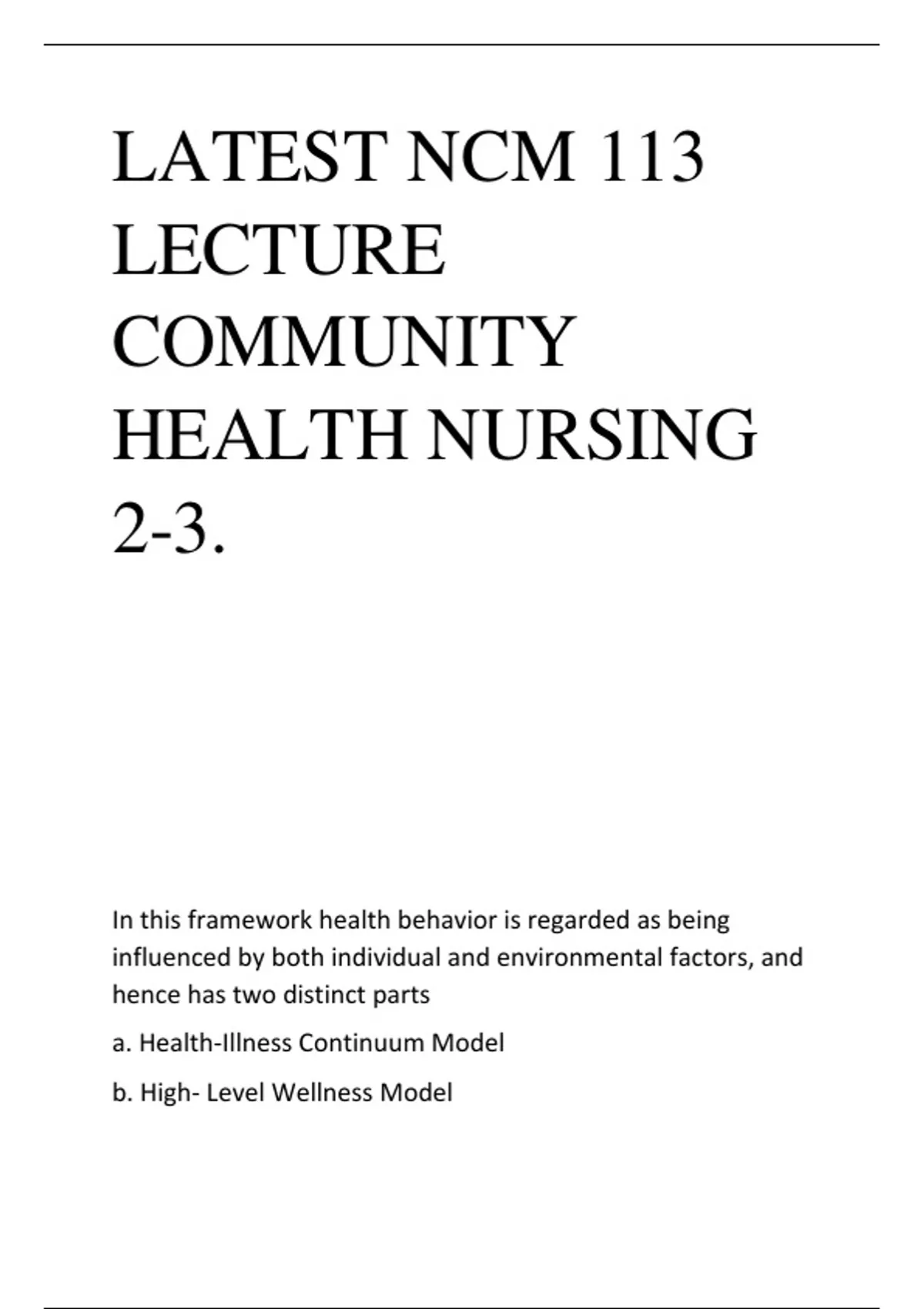 LATEST NCM 113 LECTURE COMMUNITY HEALTH NURSING 2-3. In this framework health behavior is regarded as being influenced by both individual and environmental factors, and hence has two distinct parts