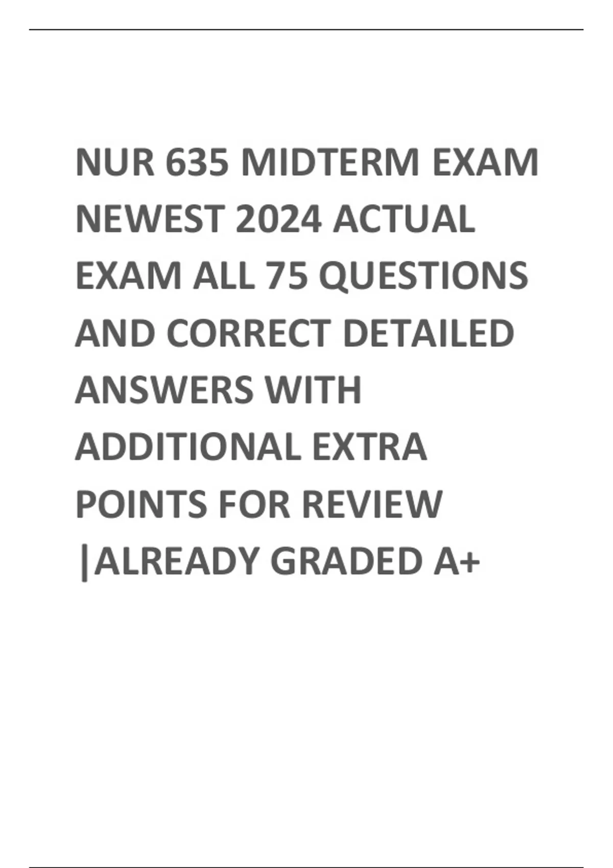 NUR 635 MIDTERM EXAM NEWEST 2024 ACTUAL EXAM ALL 75 QUESTIONS AND CORRECT DETAILED ANSWERS WITH ADDITIONAL EXTRA POINTS FOR REVIEW |ALREADY GRADED