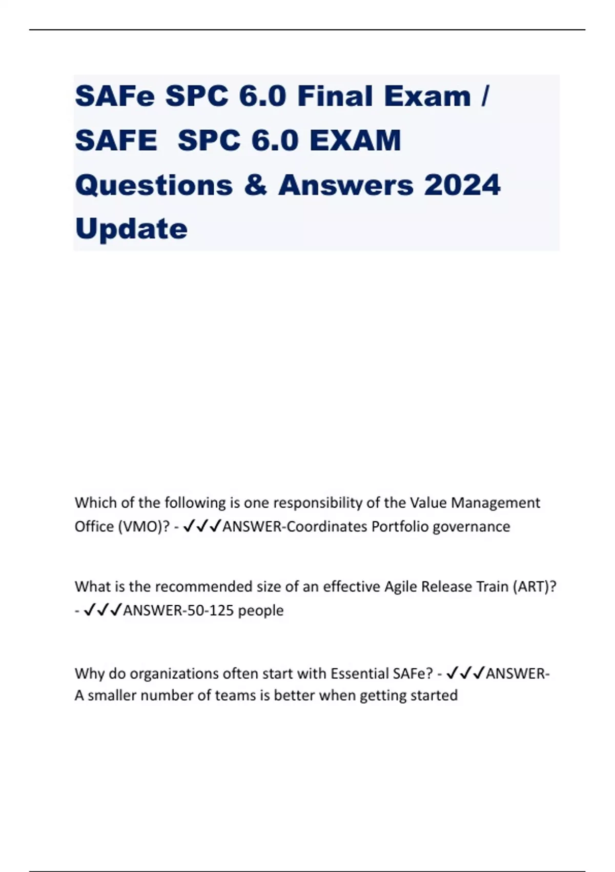 SAFe SPC 6.0 Final Exam / SAFE SPC 6.0 EXAM Questions & Answers 2024 Update
