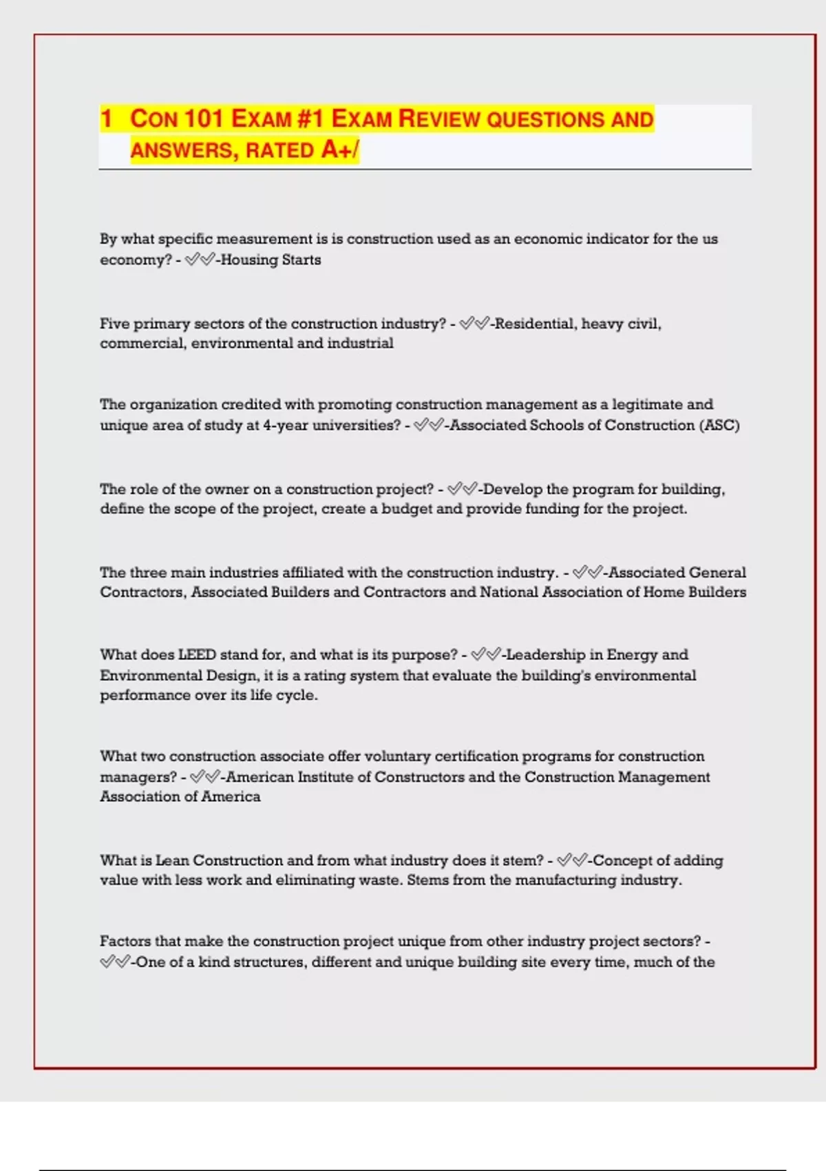 CON 101 EXAM #1 EXAM REVIEW QUESTIONS AND ANSWERS, RATED A+/ By what specific measurement is is construction used as an economic indicator for the us economy? - -Housing Starts Five primary sectors of the construction industry? - -Residential, heavy civil, commercial, environmental and industrial The organization credited with promoting construction management as a legitimate and unique area of study at 4-year universities? - -Associated Schools of Construction (ASC) The role of the owner on a construction project? - -Develop the program for building, define the scope of the project, create a budget and provide funding for the project. The three main industries affiliated with the construction industry. - -Associated General Contractors, Associated Builders and Contractors and National Association of Home Builders What does LEED stand for, and what is its purpose? - -Leadership in Energy and Environmental Design, it is a rating system that evaluate the building's environmental performance over its life cycle. What two construction associate offer voluntary certification programs for construction managers? - -American Institute of Constructors and the Construction Management Association of America What is Lean Construction and from what industry does it stem? - -Concept of adding value with less work and eliminating waste. Stems from the manufacturing industry. Factors that make the construction project unique from other industry project sectors? - -One of a kind structures, different and unique b