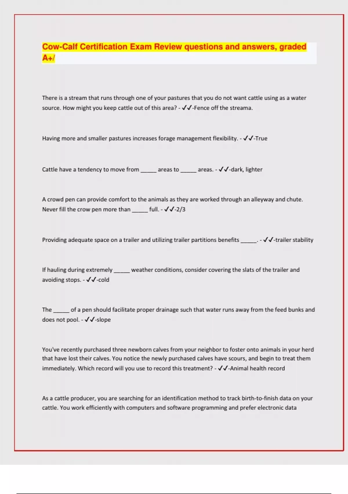 Cow-Calf Certification Exam Review questions and answers, graded A+/ There is a stream that runs through one of your pastures that you do not want cattle using as a water source. How might you keep cattle out of this area? - -Fence off the streama. Having more and smaller pastures increases forage management flexibility. - -True Cattle have a tendency to move from _____ areas to _____ areas. - -dark, lighter A crowd pen can provide comfort to the animals as they are worked through an alleyway and chute. Never fill the crow pen more than _____ full. - -2/3 Providing adequate space on a trailer and utilizing trailer partitions benefits _____. - -trailer stability If hauling during extremely _____ weather conditions, consider covering the slats of the trailer and avoiding stops. - -cold The _____ of a pen should facilitate proper drainage such that water runs away from the feed bunks and does not pool. - -slope You've recently purchased three newborn calves from your neighbor to foster onto animals in your herd that have lost their calves. You notice the newly purchased calves have scours, and begin to treat them immediately. Which record will you use to record this treatment? - -Animal health record As a cattle producer, you are searching for an identification method to track birth-to-finish data on your cattle. You work efficiently with computers and software programming a