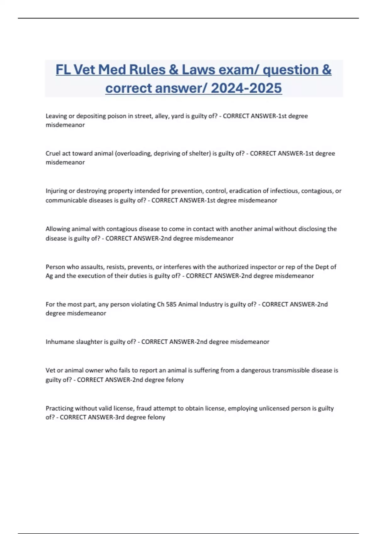 FL Vet Med Rules & Laws exam/ question & correct answer/ Leaving or depositing poison in street, alley, yard is guilty of? - CORRECT ANSWER-1st degree misdemeanor Cruel act toward animal (overloading, depriving of shelter) is guilty of? - CORRECT ANSWER-1st degree misdemeanor Injuring or destroying property intended for prevention, control, eradication of infectious, contagious, or communicable diseases is guilty of? - CORRECT ANSWER-1st degree misdemeanor Allowing animal with contagious disease to come in contact with another animal without disclosing the disease is guilty of? - CORRECT ANSWER-2nd degree misdemeano