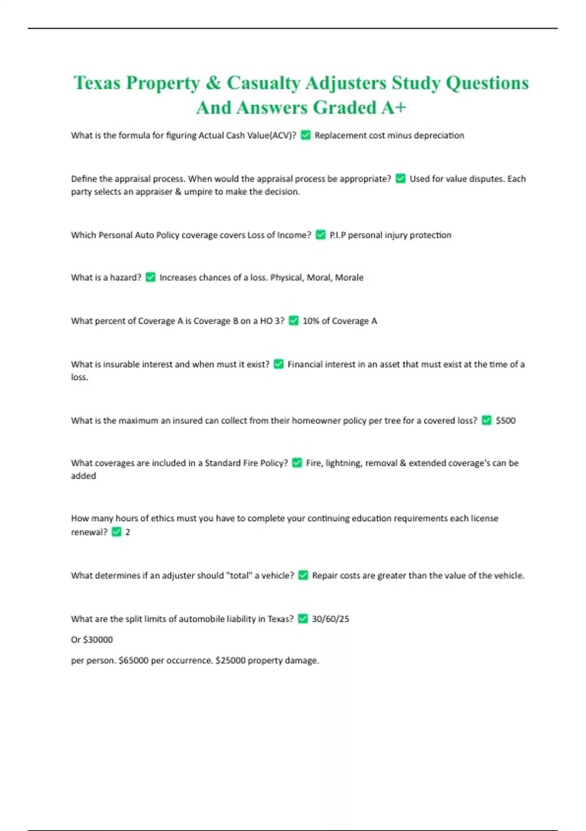 Texas Property & Casualty Adjusters Study Questions And Answers Graded A+