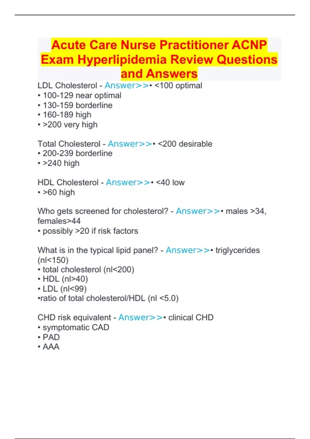 Acute Care Nurse Practitioner ACNP Exam Hyperlipidemia Review Questions and Answers