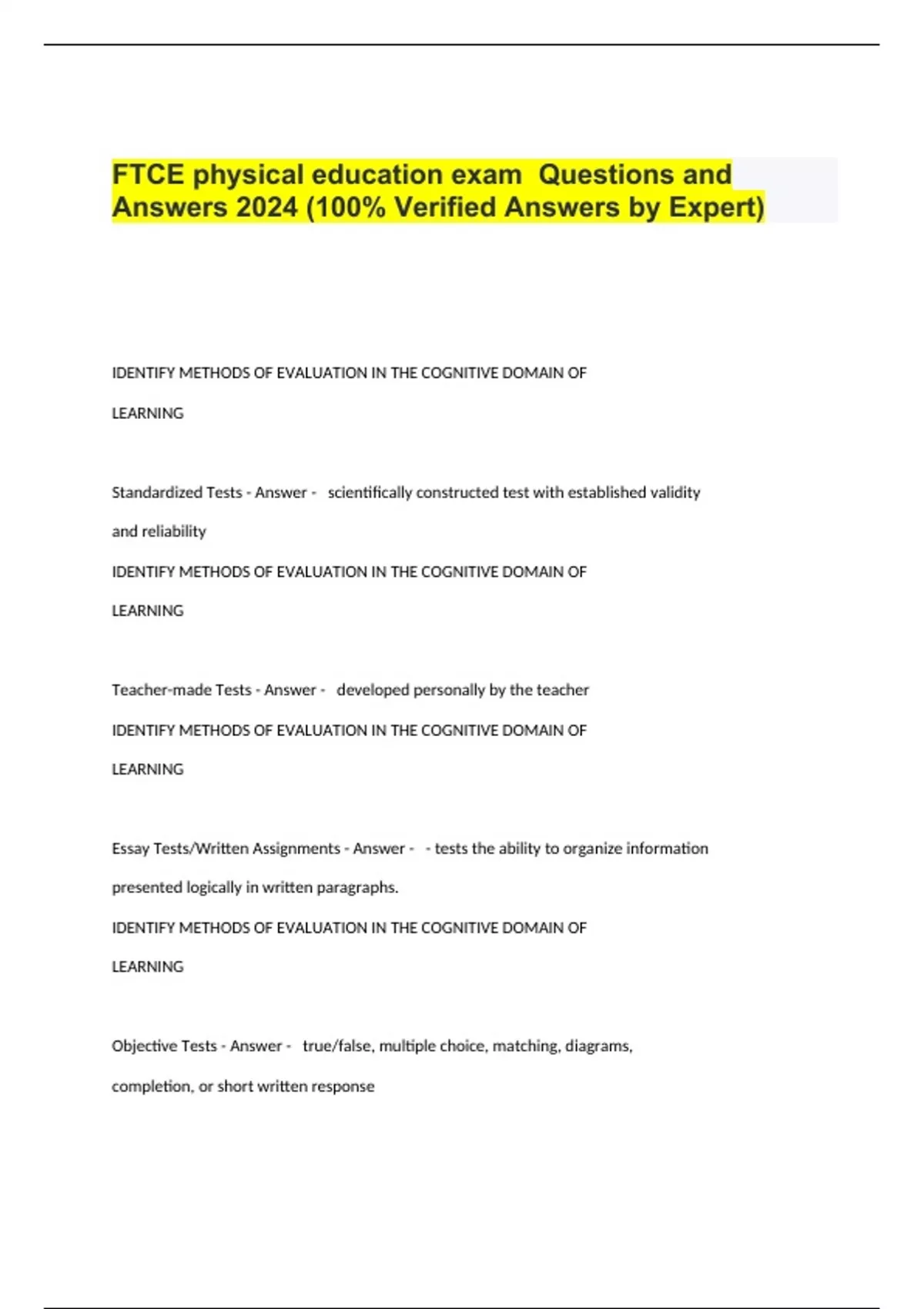 FTCE physical education exam Questions and Answers 2024 (100% Verified Answers by Expert).