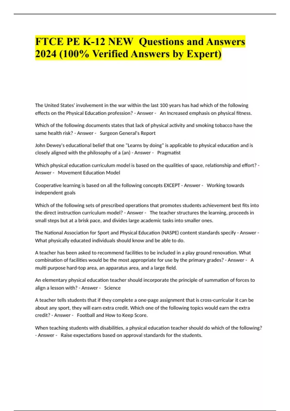 FTCE PE K-12 NEW Questions and Answers 2024 (100% Verified Answers by Expert)