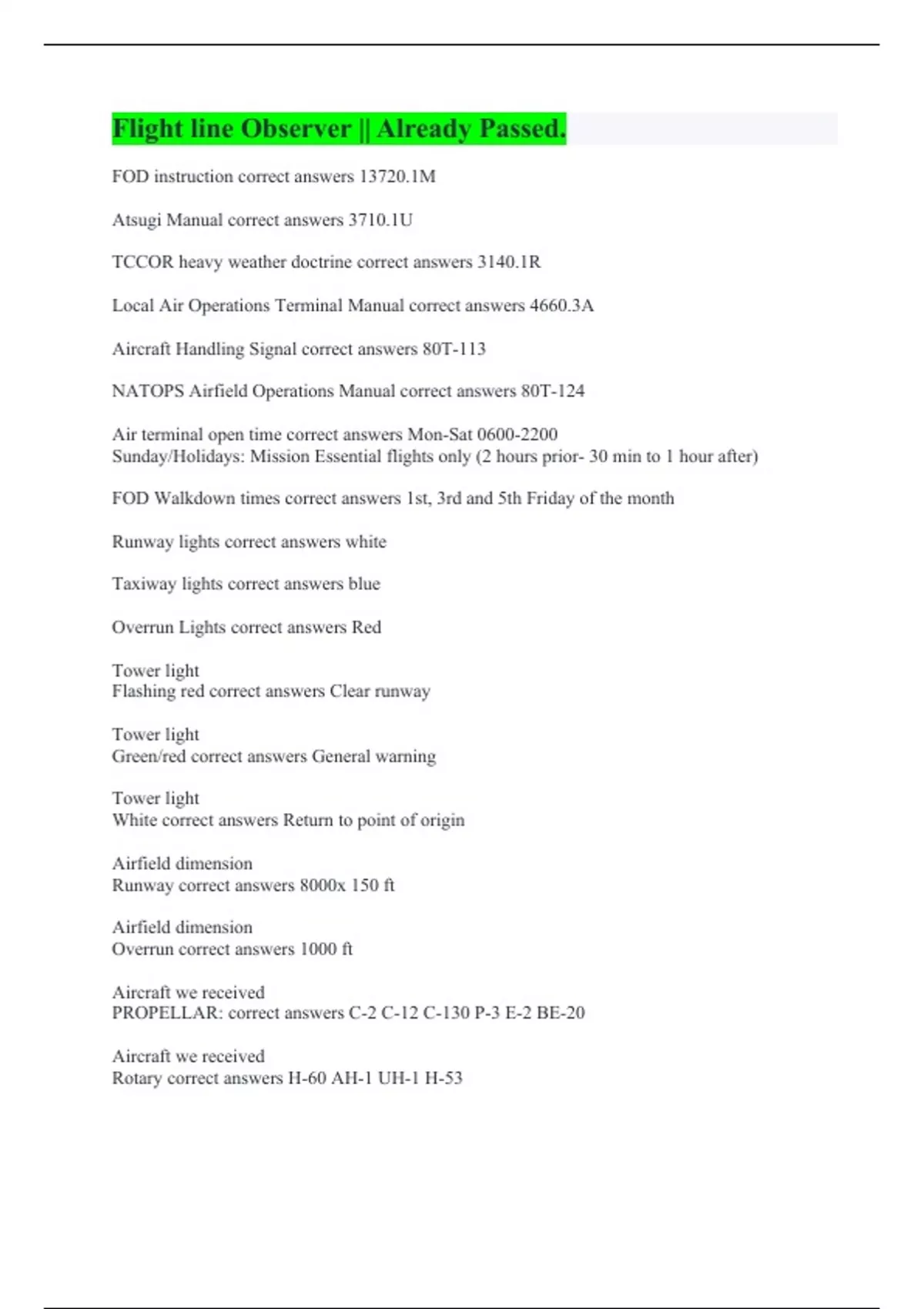 FOD instruction correct answers 13720.1M Atsugi Manual correct answers 3710.1U TCCOR heavy weather doctrine correct answers 3140.1R Local Air Operations Terminal Manual correct answers 4660.3A Aircraft Handling Signal correct answers 80T-113 NATOPS Airfield Operations Manual correct answers 80T-124 Air terminal open time correct answers Mon-Sat Sunday/Holidays: Mission Essential flights only (2 hours prior- 30 min to 1 hour after) FOD Walkdown times correct answers 1st, 3rd and 5th Friday of the month Runway lights correct answers white Taxiway lights correct answers blue Overrun Lights correct answers Red Tower light Flashing red correct answers Clear runway Tower light Green/red correct answers General warning Tower light White correct answers Return to point of origin Airfield dimension Runway correct answers 8000x 150 ft Airfield dimension Overrun correct answers 1000 ft Aircraft we received PROPELLAR: correct answers C-2 C-12 C-130 P-3 E-2 BE-20 Aircraft we received Rotary correct answers H-60 AH-1 UH-1 H-53