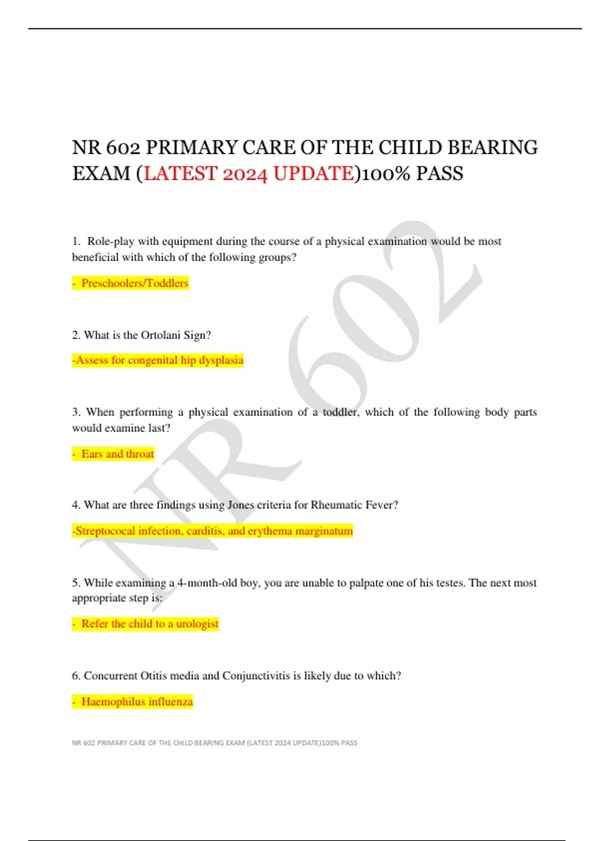 NR 602 PRIMARY CARE OF THE CHILD BEARING EXAM (LATEST 2024 UPDATE)100% PASS