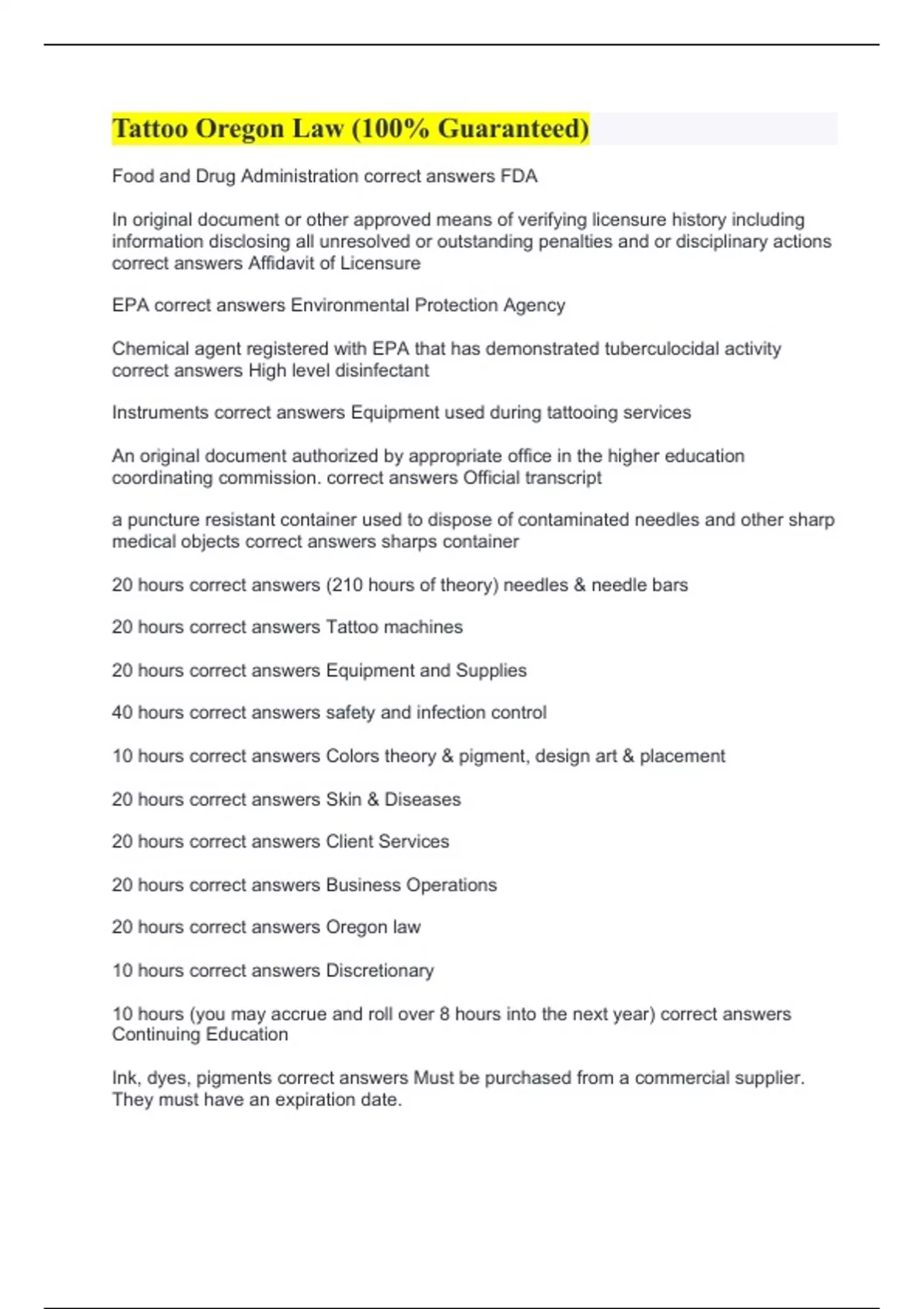 Food and Drug Administration correct answers FDA In original document or other approved means of verifying licensure history including information disclosing all unresolved or outstanding penalties and or disciplinary actions correct answers Affidavit of Licensure EPA correct answers Environmental Protection Agency Chemical agent registered with EPA that has demonstrated tuberculocidal activity correct answers High level disinfectant Instruments correct answers Equipment used during tattooing services An original document authorized by appropriate office in the higher education coordinating commission. correct answers Official transcript a puncture resistant container used to dispose of contaminated needles and other sharp medical objects correct answers sharps container 20 hours correct answers (210 hours of theory) needles & needle bars 20 hours correct answers Tattoo machines 20 hours correct answers Equipment and Supplies 40 hours correct answers safety and infection control 10 hours correct answers Colors theory & pigment, design art & placement 20 hours correct answers Skin & Diseases 20 hours correct answers Client Services 20 hours correct answers Business Operations 20 hours correct answers Oregon law 10 hours correct answers Discretionary 10 hours (you may accrue and roll over 8 hours into the next year) correct answers Continuing Education Ink, dyes, pigments correct answers Must be purchased from a commercial supplier. They must have an expiration date.