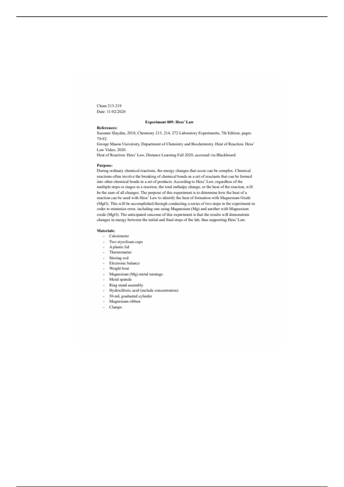 This is a comprehensive and detailed lab report in Hess' law for chem 213. Quality stuff!! You'll need it!!