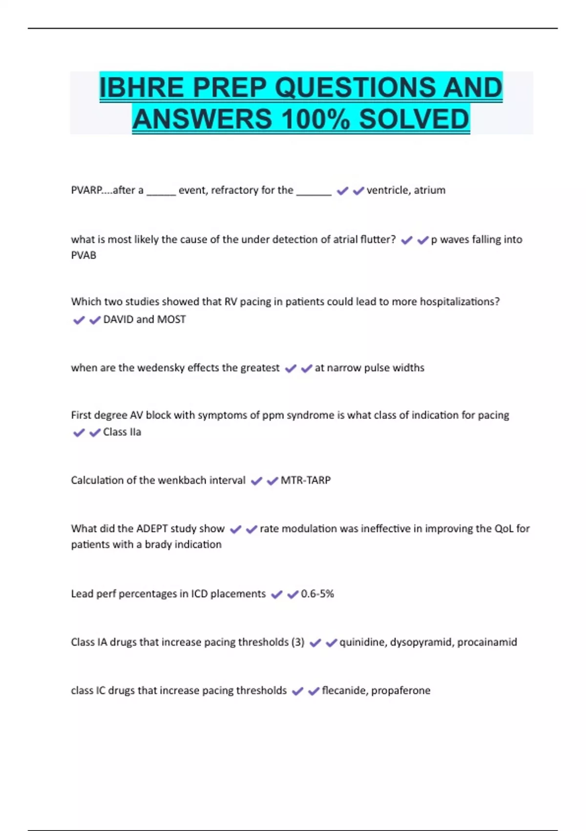 IBHRE PREP QUESTIONS AND ANSWERS 100% SOLVED PVARP....after a _____ event, refractory for the ______ ventricle, atrium what is most likely the cause of the under detection of atrial flutter? p waves falling into PVAB Which two studies showed that RV pacing in patients could lead to more hospitalizations? DAVID and MOST when are the wedensky effects the greatest at narrow pulse widths First degree AV block with symptoms of ppm syndrome is what class of indication for pacing Class IIa Calculation of the wenkbach interval MTR-TARP What did the ADEPT study show rate modulation was ineffective in improving the QoL for patients with a brady indication Lead perf percentages in ICD placements 0.6-5%