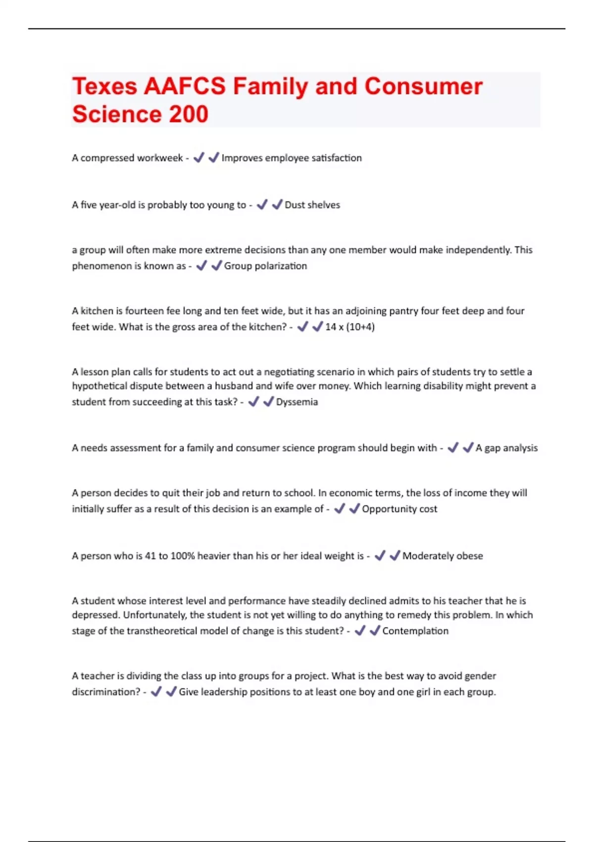 A compressed workweek - Improves employee satisfaction A five year-old is probably too young to - Dust shelves a group will often make more extreme decisions than any one member would make independently. This phenomenon is known as - Group polarization A kitchen is fourteen fee long and ten feet wide, but it has an adjoining pantry four feet deep and four feet wide. What is the gross area of the kitchen? - 14 x (10+4) A lesson plan calls for students to act out a negotiating scenario in which pairs of students try to settle a hypothetical dispute between a husband and wife over money. Which learning disability might prevent a student from succeeding at this task? - Dyssemia A needs assessment for a family and consumer science program should begin with - A gap analysis A person decides to quit their job and return to school. In economic terms, the loss of income they will initially suffer as a result of this decision is an example of - Opportunity cost A person who is 41 to 100% heavier than his or her ideal weight is - Moderately obese A student whose interest level and performance have steadily declined admits to his teacher that he is depressed. Unfortunately, the student is not yet willing to do anything to remedy this problem. In which stage of the transtheoretical model of change is this student? - Contemplation A teacher is dividing the class up into groups for a project. What is the best way to avoid gender discrimination? - Give leadership positions to at least one boy and one girl in each group.According to John Gottman, which of the following is the best response to criticism by a spouse? - Humor According to personal finance experts, what is the maximum percentage of income a family should spend on housing? - 25% According to Piaget's model, the ability to imagine the mental lives of other emerges during the - Preoperational Stage According to research, high levels of premarital conflict are predictive of - Marital happiness An activity that requires students to describe their ideal home falls within the - Affective domian An effective time management plan - Encourages students to do their most difficult tasks first. An employment arrangement where employees divide the work schedule to allow each employee more time with family is called - Job sharing An ovo-lacto-vegetarian is a person who eats - Fruits, vegetables, grains, dairy products, and eggs Based on their contribution to foodborne illness, chemical additives (incidental and intentional) - Are seldom involved in foodborne illness Borrowers with a poor credit rating will not be eligible for a bank's - Prime Rate Children between the ages of six and eight should be able to - Count coins Creating a list of things to do is less necessary - When a daily routine has been established