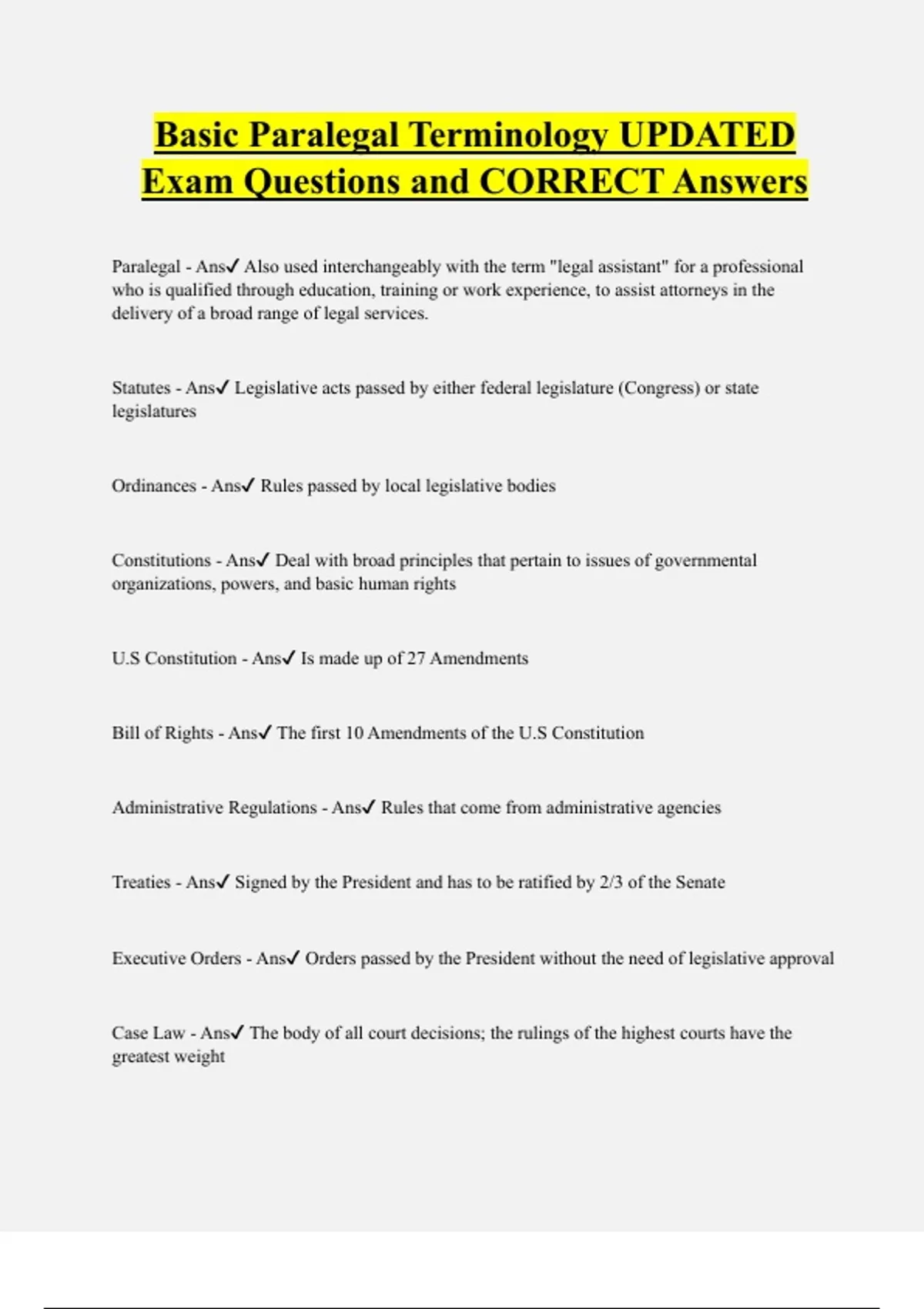 Basic Paralegal Terminology UPDATED Exam Questions and CORRECT Answers Paralegal - Ans Also used interchangeably with the term "legal assistant" for a professional who is qualified through education, training or work experience, to assist attorneys in the delivery of a broad range of legal services. Statutes - Ans Legislative acts passed by either federal legislature (Congress) or state legislatures