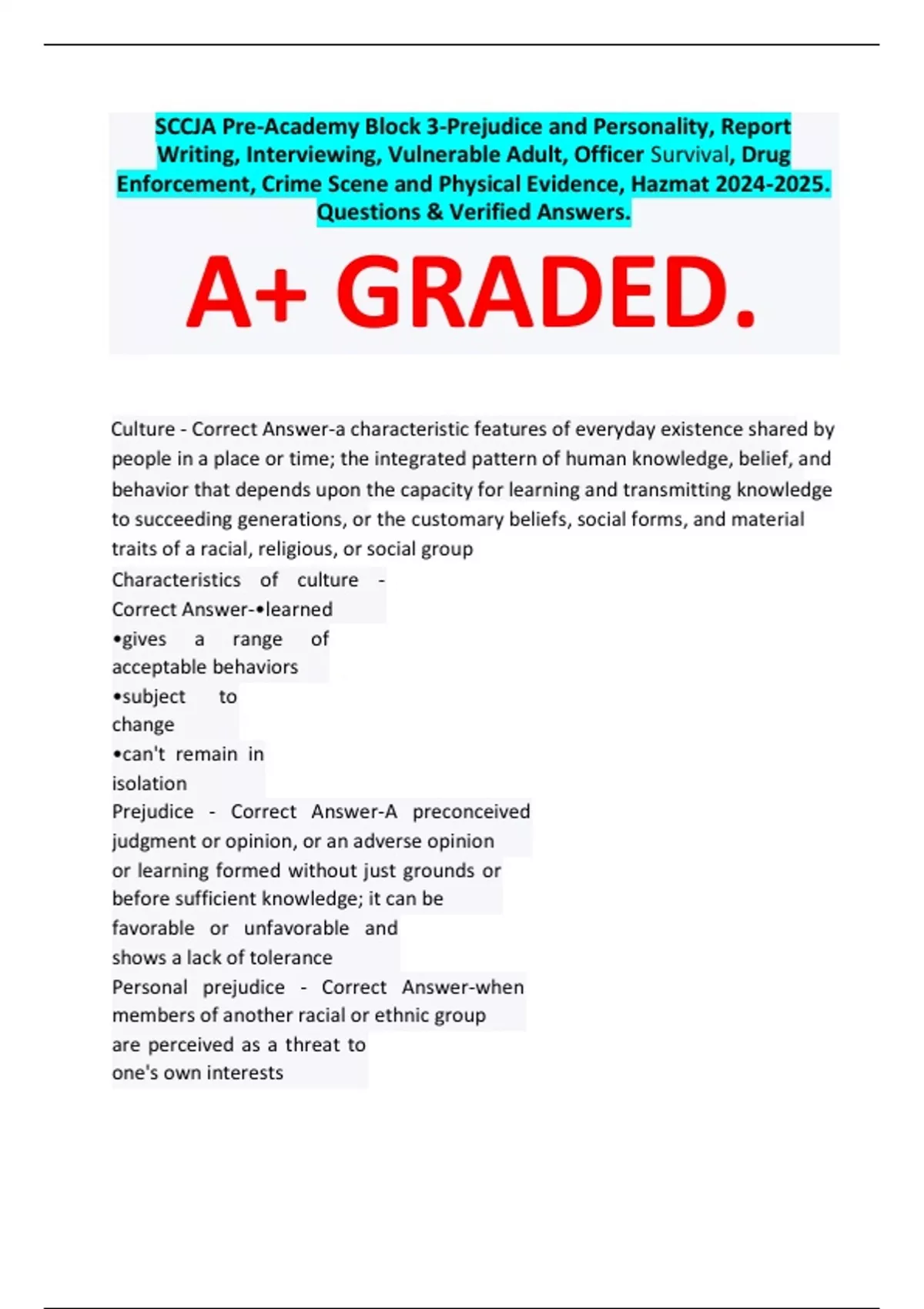 SCCJA Pre-Academy Block 3-Prejudice and Personality, Report Writing, Interviewing, Vulnerable Adult, Officer Survival, Drug Enforcement, Crime Scene and Physical Evidence, Hazmat . Questions & Verified Answers. A+ GRADED. Culture - Correct Answer-a characteristic features of everyday existence shared by people in a place or time; the integrated pattern of human knowledge, belief, and behavior that depends upon the capacity for learning and transmitting knowledge to succeeding generations, or the customary beliefs, social forms, and material traits of a racial, religious, or social group Characteristics of culture - Correct Answer-•learned •gives a range of acceptable behaviors •subject to change •can't remain in isolation Prejudice - Correct Answer-A preconceived judgment or opinion, or an adverse opinion or learning formed without just grounds or before sufficient knowledge; it can be favorable or unfavorable and shows a lack of tolerance Personal prejudice - Correct Answer-when members of another racial or ethnic group are perceived as a threat to one's own interests Group prejudice - Correct Answer-When a person conforms to group norms because it appears that is what is expected Stanford Prison Experiment - Correct Answer-study conducted to investigate the effects of becoming a prisoner or prison guard and role playing Brown Eyes, Blue Eyes Experiment - Correct Answer-Study conducted to demonstrate his prejudicial attitudes and intolerance can affect even the youngest of people intolerance - Correct Answer-unwillingness to accept views, beliefs, or behavior that differ from one's own; based on ignorance, indifference, and limited perception ignorance - Correct Answer-lack of knowledge or information indifference - Correct Answer-lack of interest, concern, or sympathy Limited perception - Correct Answer-Perceiving others through a range of limited experiences which ultimately could create stereotyping of an entire group stereotype - Correct Answer-a generalized (sometimes accurate but often overgeneralized) belief about a group of people 3 ways stereotypes change - Correct Answer-• Bookkeeping-slow adjustment as we learn and adapt to new information • Conversion-old stereotypes are thrown away, usually when there is signification contradictory evidence • Subtyping-new stereotype is created as a sub-classification of the original Hate crime - Correct Answer-criminal offense against a person or property motivated in whole or in part by an offender's bias against a race, religion, disability, ethnic origin or sexual orientation Wisconsin v. Mitchell - Correct Answer-court upheld statute providing for higher penalties if a criminal selects a victim because of their race, religion, or sexual orientation Arguments for hate crime legislation - Correct Answer-•a victim may suffer more psychological harm •victim may suffer more physical trauma •hate crimes have a wide impact •hate crimes may spark retaliation or community unrest Police response at the scene of a hate crime - Correct Answer-•secure the scene •stabilization the victim •preserve the crime scene •identify criminal evidence •1 officer interview the victim •report crime to supervisor •document thoroughly •determine if probable cause exists for arrest How to determine if a hate crime has been committed - Correct Answer-•perceptions of victim and witnesses •suspect's reflection of bias •any differences between victim and suspect •similar incidents in same or nearby location •whether victim was promoting group allegiance •whether incident was close or coincided with a significant holiday for victim •absence of other motive Reasons hate crime victims may not come forward - Correct Answer-•fear of retaliation •humiliation •lack of support •cultural or language barriers Interview techniques for victims of a hate crime - Correct Answer-•reassure them it is not their fault •try to ascertain why the victim feels this happened to them •create an open dialogue •hold neighborhood meetings to ensure community awareness Gold Personality - Correct Answer-•keeper of tradition •motivation is to belong •feel there is a right way to do everything •majority of police officers Green Personality - Correct Answer-•always questioning the status quo •motivation is a quest for power •knowledge is power •visionaries and careful planners Blue Personality - Correct Answer-•searching for meaning of life •motivation is to feel authentic •yearn for self-actualization •peacemakers and cooperative team players Orange Personality - Correct Answer-•wants to do things now •motivation is to be free •like variety and spontaneity •enjoy action and competition Baby Boomers - Correct Answer-•people born between 1946 and 1964 •work to live •motivated by people who tell them they are valued and needed Generation X - Correct Answer-•people born between 1965 and 1980 •self reliant •challenge authority •motivated by hands-off approach Generation Y (Millennials) - Correct Answer-•people both between •motivated by being surrounding with bright, creative people •change jobs frequently •value realism, confidence, and fun Who reads police reports - Correct Answer-•supervisors •investigators •attorneys •judges •backup officers •victims •civil courts •probation officers •advocates •the media Communication - Correct Answer-The exchange of information or the technique of expressing ideas effectively Report - Correct Answer-Any written or electronic communication on a departmental firm Report form - Correct Answer-A preprinted, standardized set of questions Common characteristics of a report - Correct Answer-•made at or about the time of an event and should be accurate to the best of the officer's knowledge •should also reflect what the officer heard at the time of the incident •reports serve as permanent records of events Operational reports -