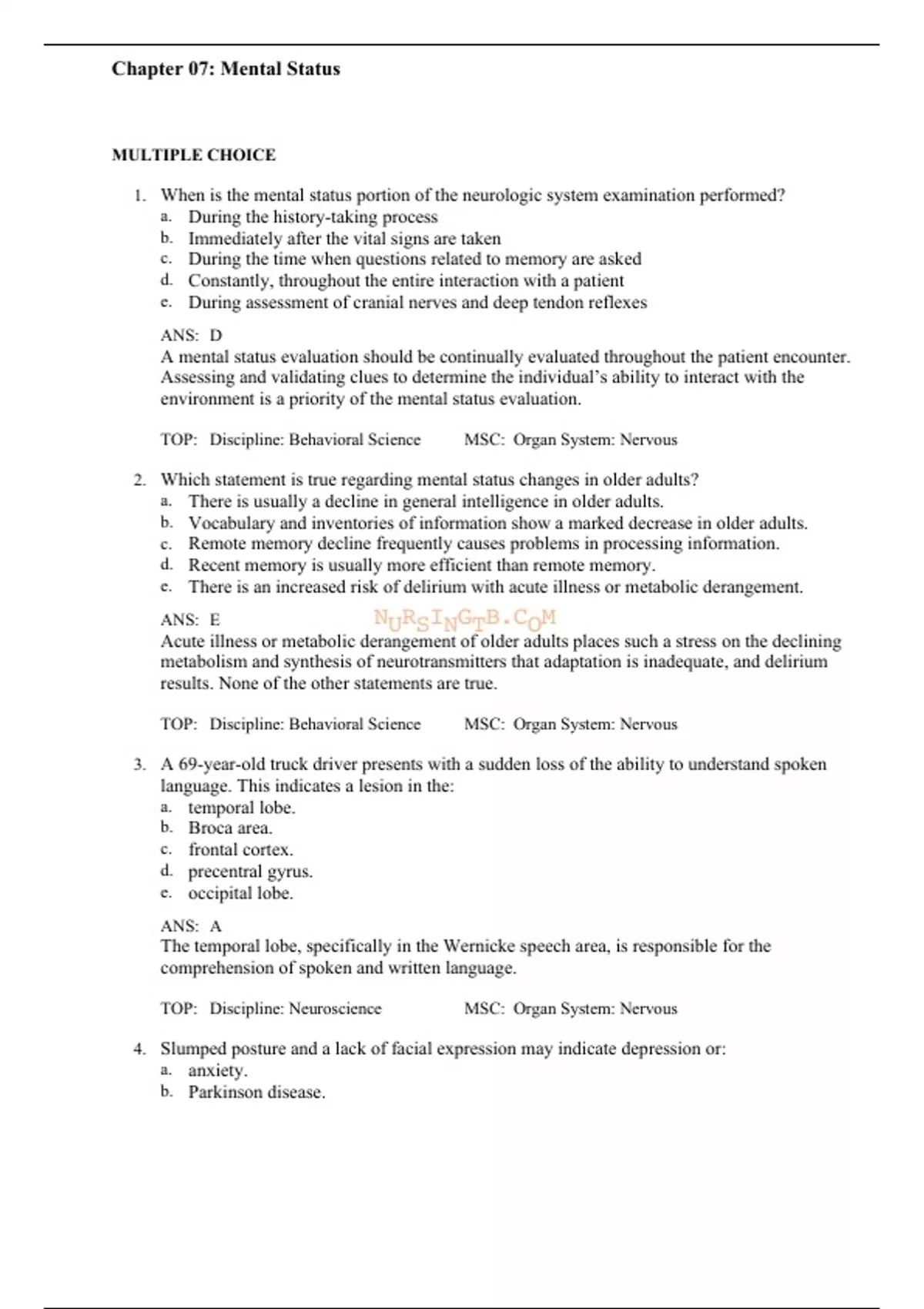 Exam of 6 pages for the course NURSING MISC at South Georgia College (7. Mental Status)