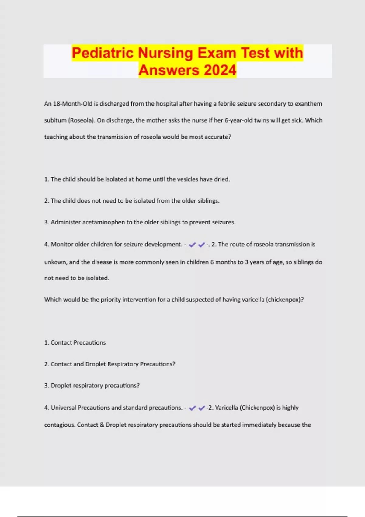 Pediatric Nursing Exam Test with Answers 2024 An 18-Month-Old is discharged from the hospital after having a febrile seizure secondary to exanthem subitum (Roseola). On discharge, the mother asks the nurse if her 6-year-old twins will get sick. Which teaching about the transmission of roseola would be most accurate? 1. The child should be isolated at home until the vesicles have dried. 2. The child does not need to be isolated from the older siblings. 3. Administer acetaminophen to the older siblings to prevent seizures. 4. Monitor older children for seizure development. - -. 2. The route of roseola transmission is unkown, and the disease is more commonly seen in children 6 months to 3 years of age, so siblings do not need to be isolated. Which would be the priority intervention for a child suspected of having varicella (chickenpox)? 1. Contact Precautions 2. Contact and Droplet Respiratory Precautions? 3. Droplet respiratory precautions? 4. Universal Precautions and standard precautions. - -2. Varicella (Chickenpox) is highly contagious. Contact & Droplet respiratory precautions should be started immediately because the primary source of transmission is secretions of the respiratory tract (droplet) and also by contaminated objects. Caladryl - -A lotion containing