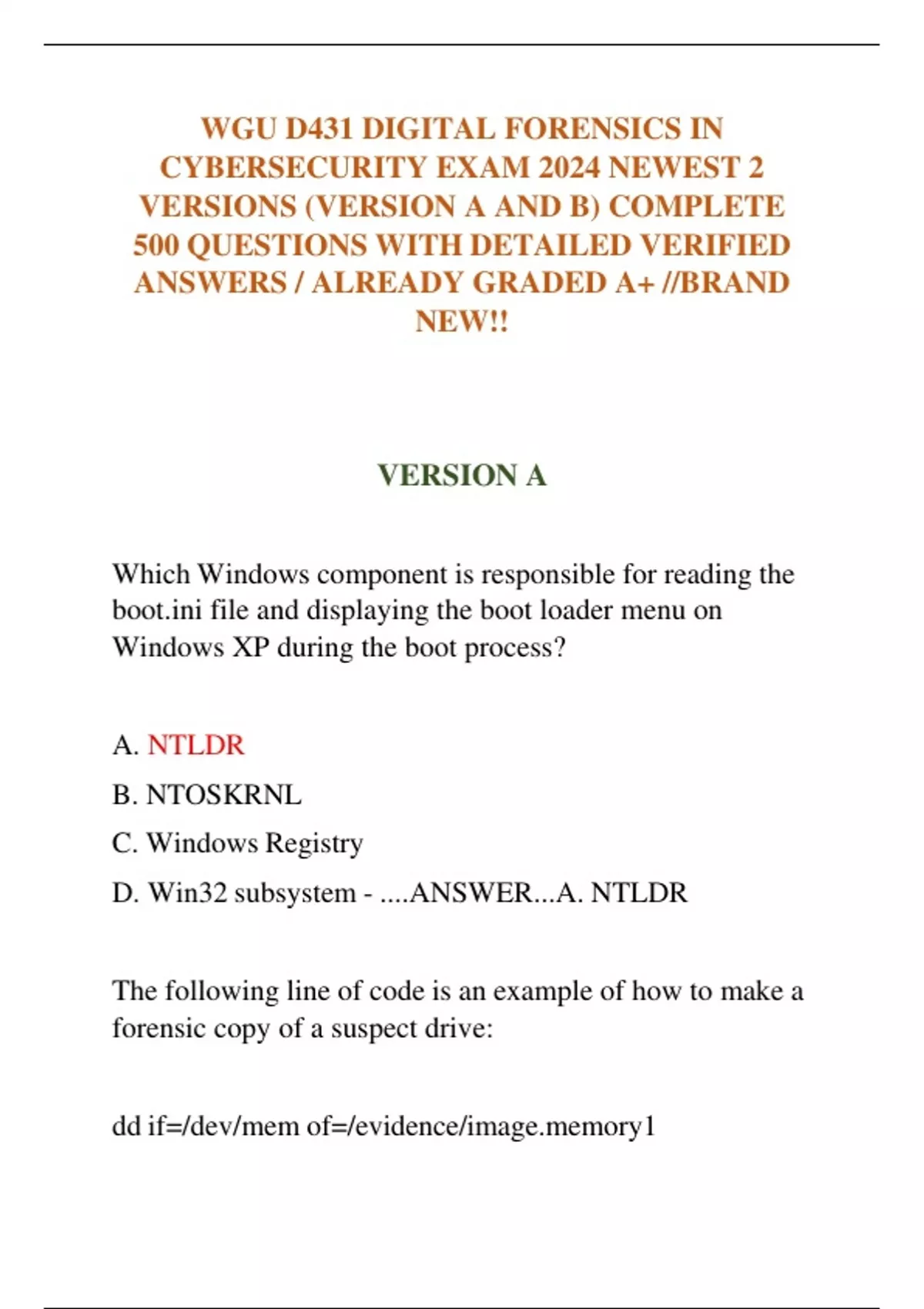 WGU D431 DIGITAL FORENSICS IN CYBERSECURITY EXAM 2024 NEWEST 2 VERSIONS (VERSION A AND B) COMPLETE 500 QUESTIONS WITH DETAILED VERIFIED ANSWERS / ALREADY GRADED A+ //BRAND NEW!!
