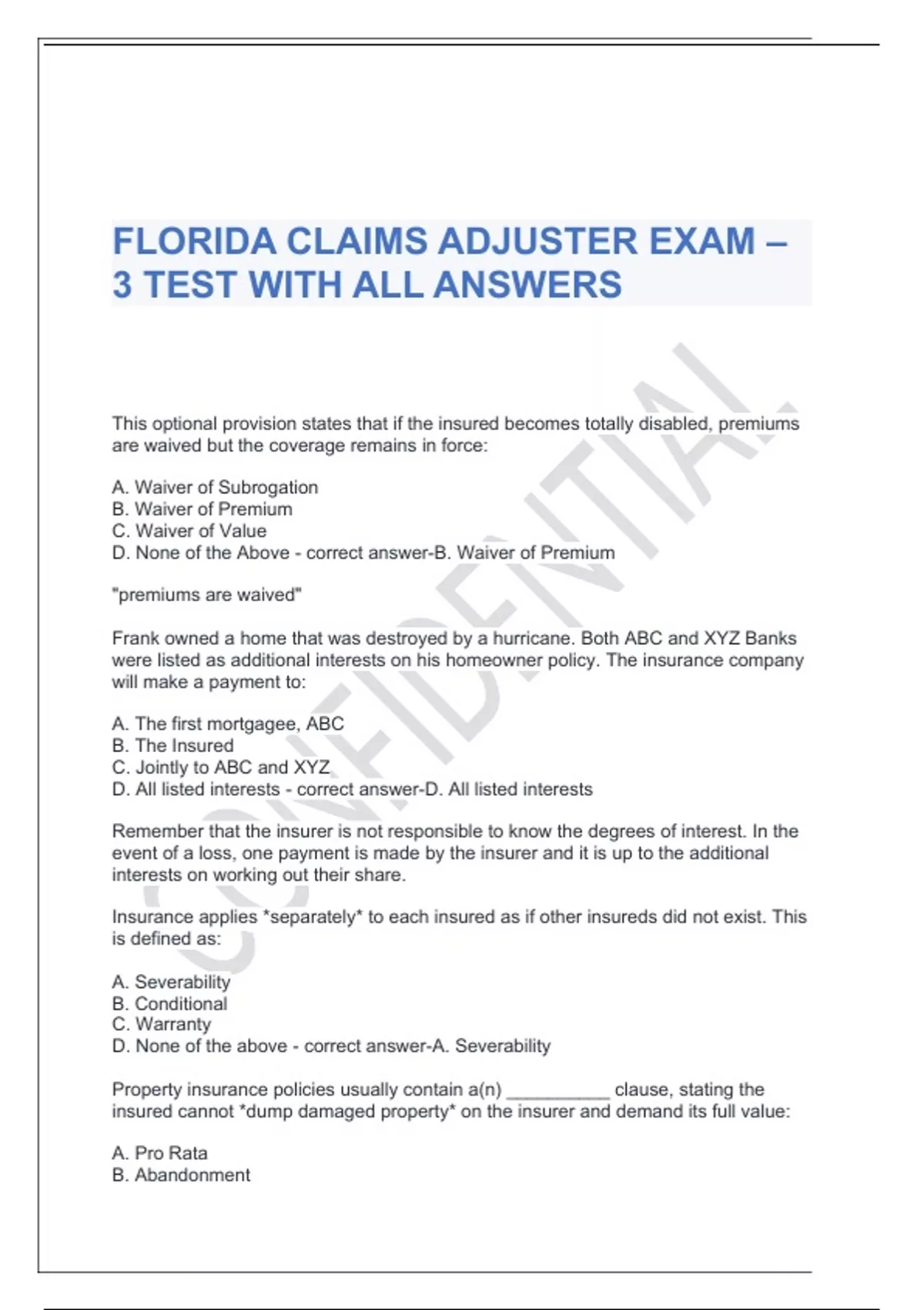 FLORIDA CLAIMS ADJUSTER EXAM – 3 TEST WITH ALL ANSWERS