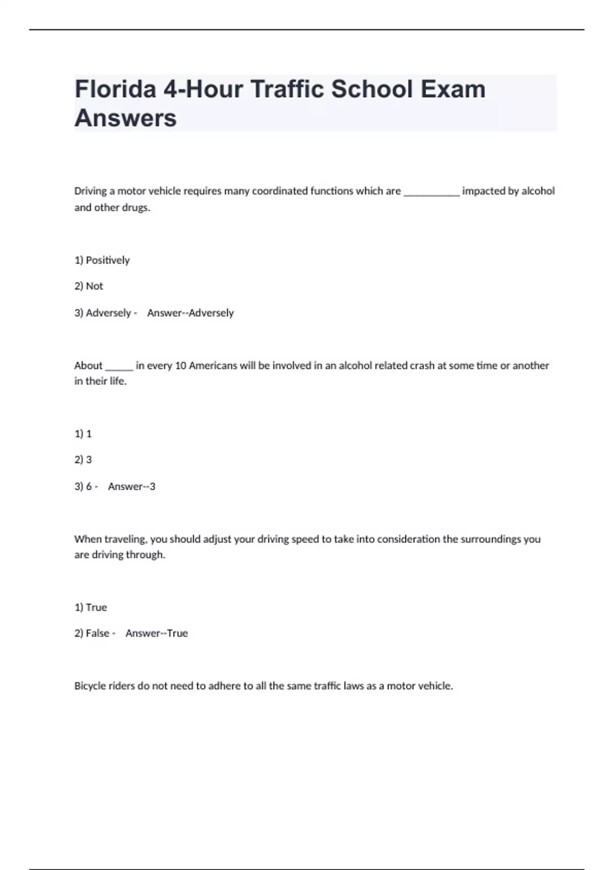 Florida 4-Hour Traffic School Exam Answers.