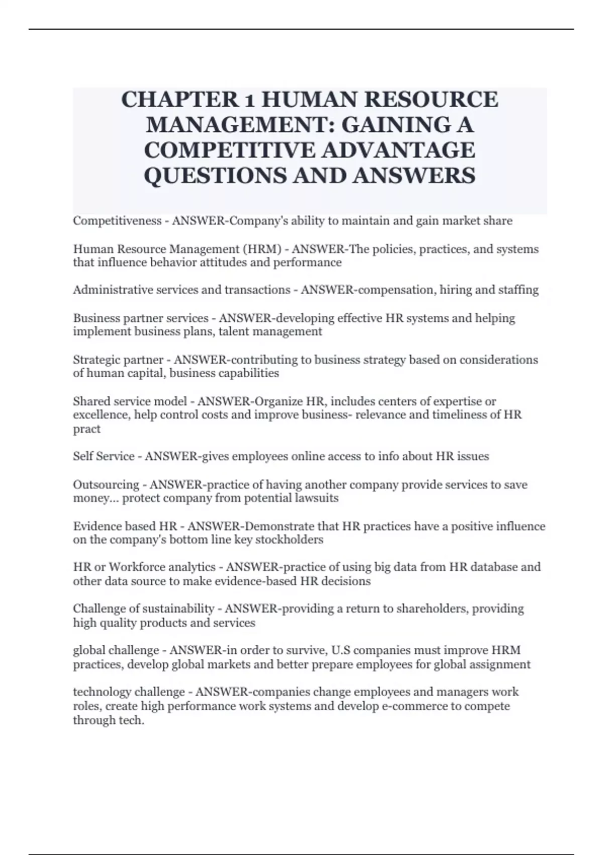 CHAPTER 1 HUMAN RESOURCE MANAGEMENT: GAINING A COMPETITIVE ADVANTAGE QUESTIONS AND ANSWERS