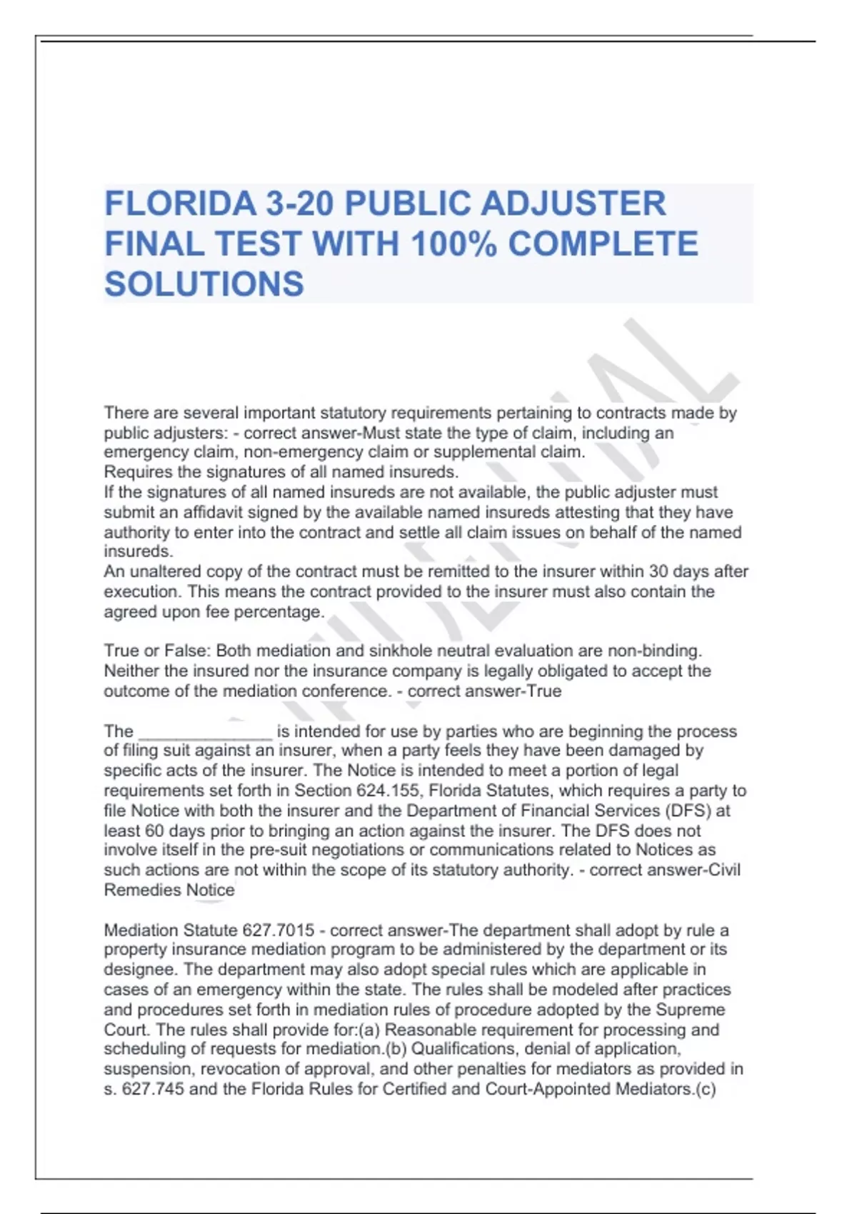 FLORIDA 3-20 PUBLIC ADJUSTER FINAL TEST WITH 100% COMPLETE SOLUTIONS