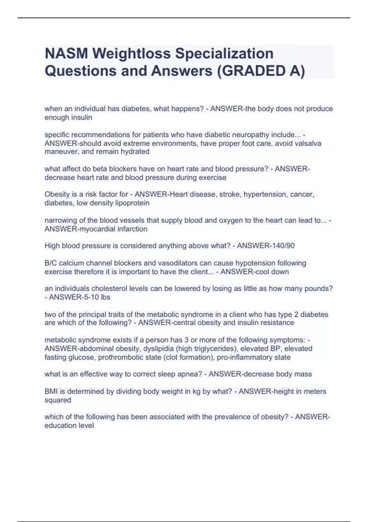 NASM Weightloss Specialization Questions and Answers (GRADED A) NASM Weightloss Specialization Questions and Answers (GRADED A) NASM Weightloss Specialization Questions and Answers (GRADED A) NASM Weightloss Specialization Questions and Answers (GRADED A) when an individual has diabetes, what happens? - ANSWER-the body does not produce enough insulin specific recommendations for patients who have diabetic neuropathy include... - ANSWER-should avoid extreme environments, have proper foot care, avoid valsalva maneuver, and remain hydrated what affect do beta blockers have on heart rate and blood pressure? - ANSWER-decrease heart rate and blood pressure during exercise