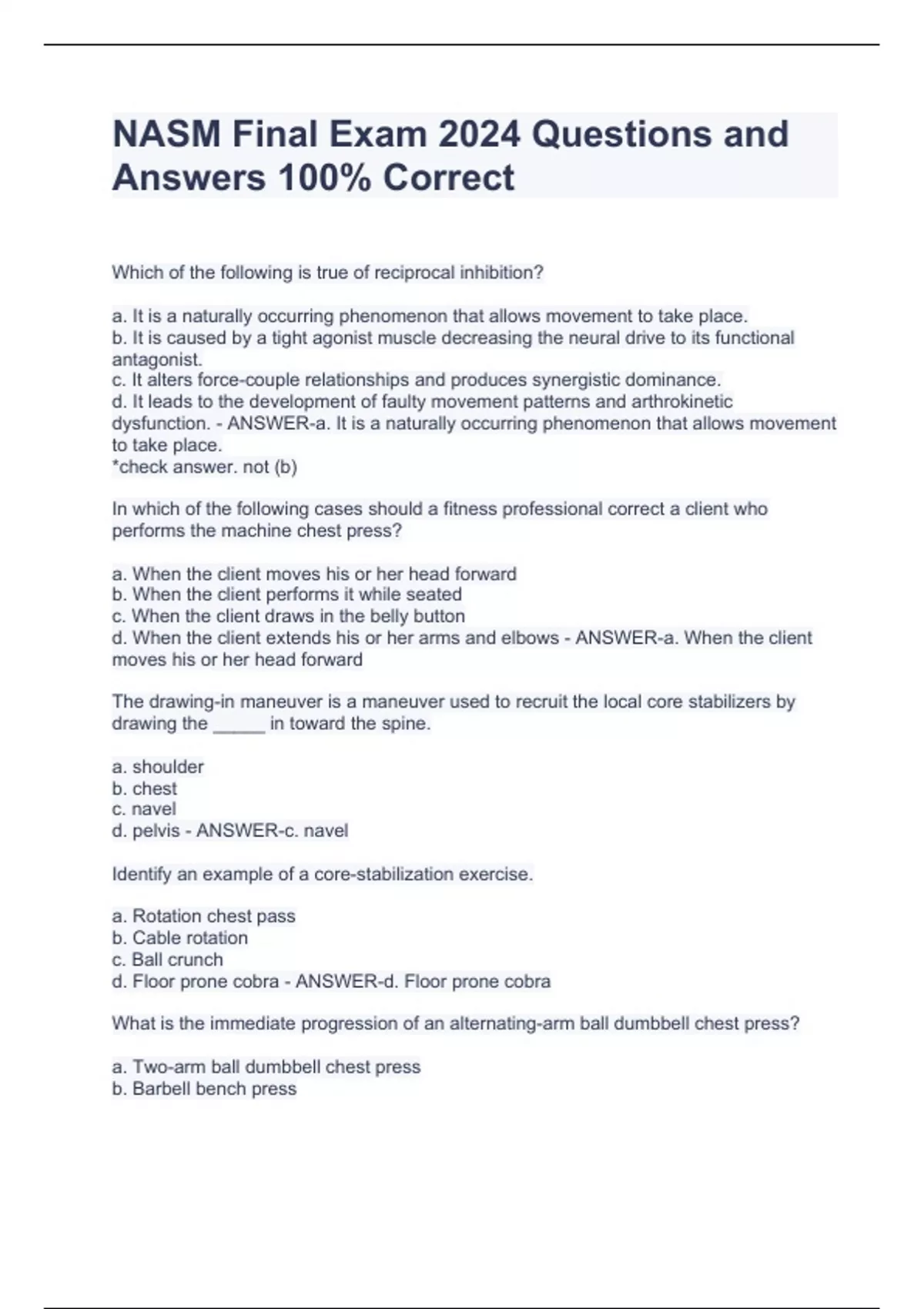 NASM Final Exam 2024 Questions and Answers 100% Correct NASM Final Exam 2024 Questions and Answers 100% Correct NASM Final Exam 2024 Questions and Answers 100% Correct NASM Final Exam 2024 Questions and Answers 100% Correct Which of the following is true of reciprocal inhibition? a. It is a naturally occurring phenomenon that allows movement to take place. b. It is caused by a tight agonist muscle decreasing the neural drive to its functional antagonist. c. It alters force-couple relationships and produces synergistic dominance. d. It leads to the development of faulty movement patterns and arthrokinetic dysfunction. - ANSWER-a. It is a naturally occurring phenomenon that allows movement to take place. *check answer. not (b) In which of the following cases should a fitness professional correct a client who performs the machine chest press?