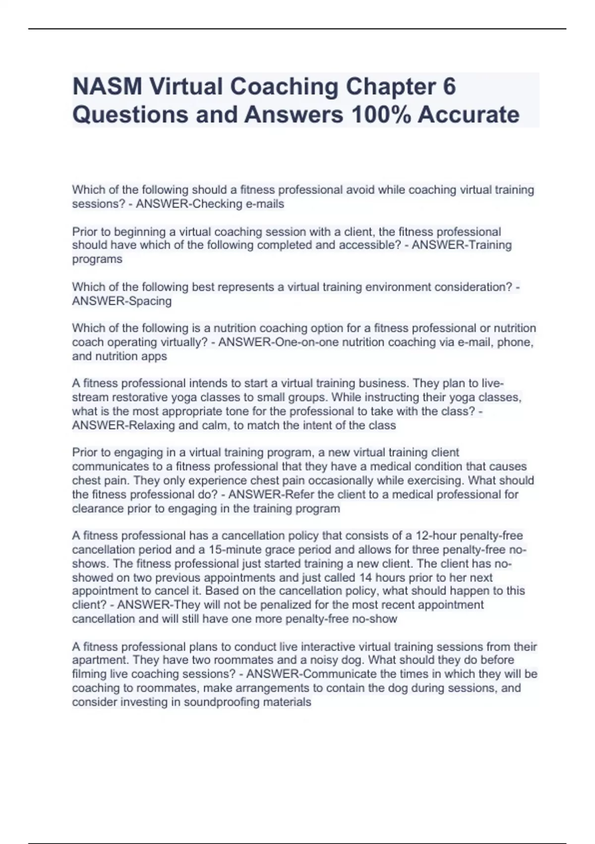 NASM Virtual Coaching Chapter 6 Questions and Answers 100% Accurate NASM Virtual Coaching Chapter 6 Questions and Answers 100% Accurate NASM Virtual Coaching Chapter 6 Questions and Answers 100% Accurate NASM Virtual Coaching Chapter 6 Questions and Answers 100% Accurate NASM Virtual Coaching Chapter 6 Questions and Answers 100% Accurate Which of the following should a fitness professional avoid while coaching virtual training sessions? - ANSWER-Checking e-mails Prior to beginning a virtual coaching session with a client, the fitness professional should have which of the following completed and accessible? - ANSWER-Training programs