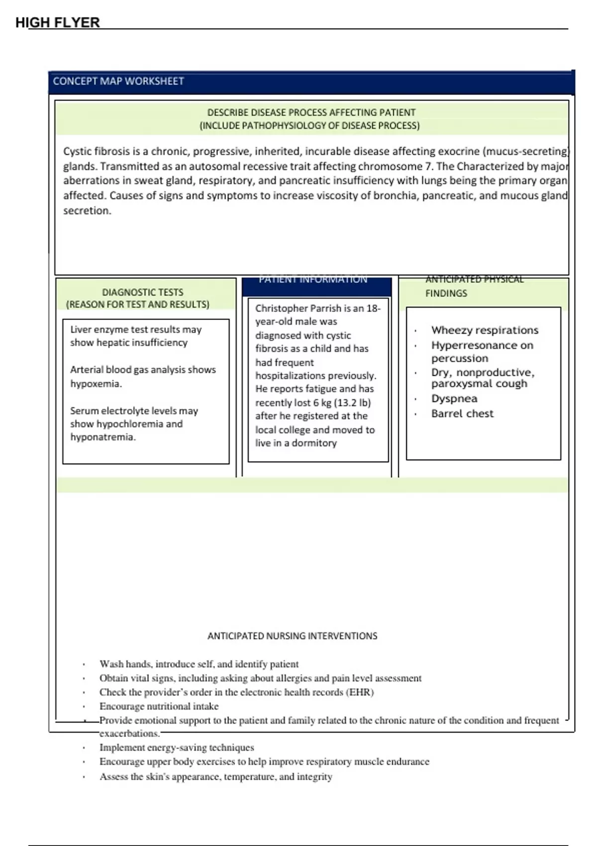 VSIM Christopher Parrish Diagnosis: Cystic Fibrosis feedback log - Scored 100% (latest 2023) DESCRIBE DISEASE PROCESS AFFECTING PATIENT (INCLUDE PATHOPHYSIOLOGY OF DISEASE PROCESS) Cystic fibrosis is a chronic, progressive, inherited, incurable disease affecting exocrine (mucus-secreting) glands. Transmitted as an autosomal recessive trait affecting chromosome 7. The Characterized by major aberrations in sweat gland, respiratory, and pancreatic insufficiency with lungs being the primary organ affected. Causes of signs and symptoms to increase viscosity of bronchia, pancreatic, and mucous gland secretion. DIAGNOSTIC TESTS (REASON FOR TEST AND RESULTS) PATIENT INFORMATION Christopher Parrish is an 18- year-old male was diagnosed with cystic fibrosis as a child and has had frequent hospitalizations previously. He reports fatigue and has recently lost 6 kg (13.2 lb) after he registered at the local college and moved to live in a dormitory ANTICIPATED PHYSICAL FINDINGS • Wheezy respirations • Hyperresonance on percussion • Dry, nonproductive, paroxysmal cough • Dyspnea • Barrel chest ANTICIPATED NURSING INTERVENTIONS • Wash hands, introduce self, and identify patient • Obtain vital signs, including asking about allergies and pain level assessment • Check the provider’s order in the electronic health records (EHR) • Encourage nutritional intake • Provide emotional support to the patient and family related to the chronic nature of the condition and frequent exacerbations. • Implement energy-saving techniques • Encourage upper body exercises to help improve respiratory muscle endurance • Assess the skin's appearance, temperature, and integrity Liver enzyme test results may show hepatic insufficiency Arterial blood gas analysis shows hypoxemia. Serum electrolyte levels may show hypochloremia and hyponatremia.