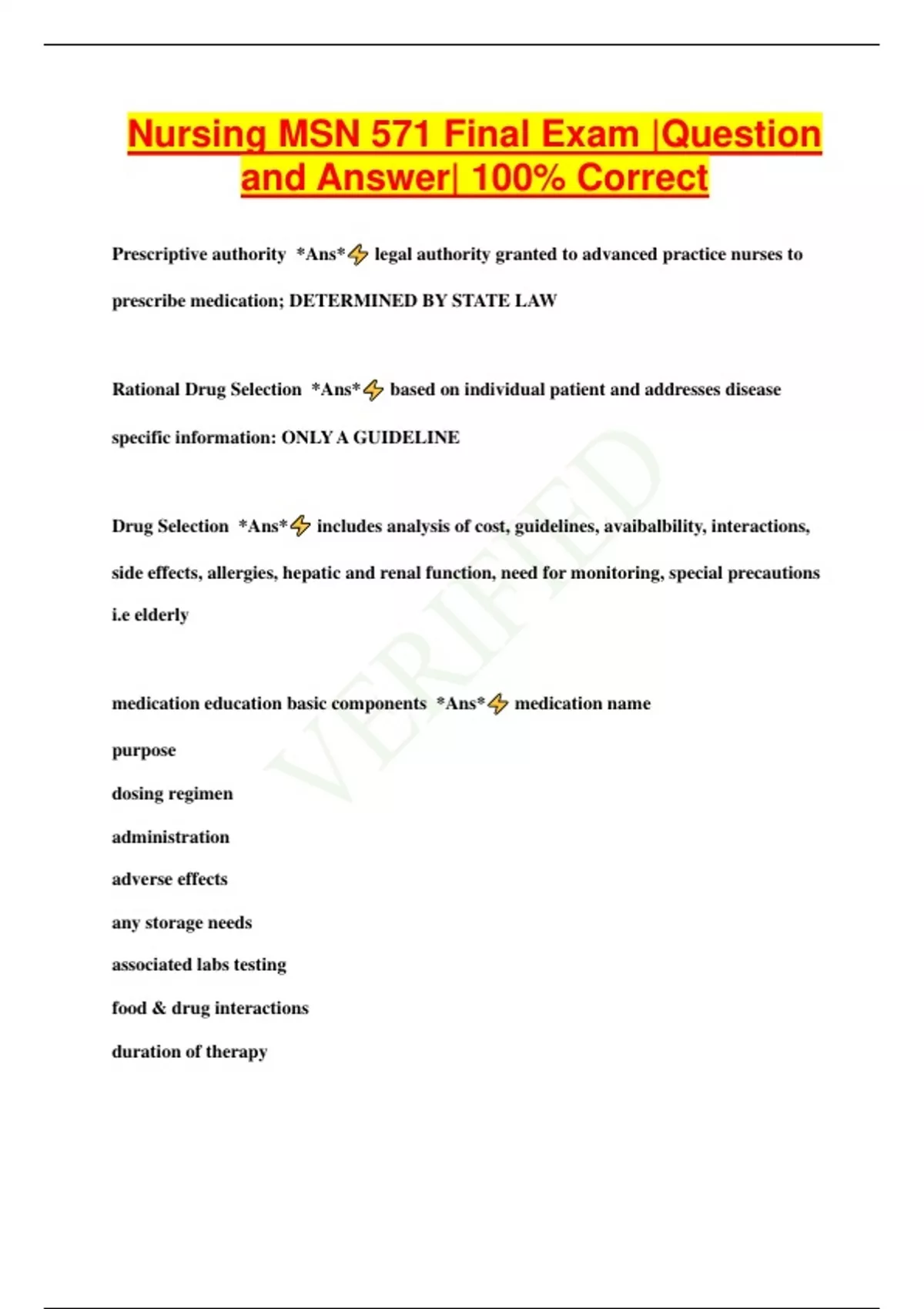 Nursing MSN 571 Final Exam |Question and Answer| 100% Correct Prescriptive authority *Ans* legal authority granted to advanced practice nurses to prescribe medication; DETERMINED BY STATE LAW Rational Drug Selection *Ans* based on individual patient and addresses disease specific information: ONLY A GUIDELINE Drug Selection *Ans* includes analysis of cost, guidelines, avaibalbility, interactions, side effects, allergies, hepatic and renal function, need for monitoring, special precautions i.e elderly medication education basic components *Ans* medication name purpose dosing regimen administration adverse effects any storage needs associated labs testing food & drug interactions duration of therapy medication adherence *Ans* barriers to adherence= forgetfulness lack of planning cost dissatisfaction altered dosing Phamacokinetics *Ans* study of drug movement throughout body principles of pharmacokinetics *Ans* absorption distribution metabolism excretion Passage of drugs across membranes *Ans* - channels and pores - transport systems (P-glycoprotein) - direct penetration of the membrane Absorption of drugs *Ans* Transfer of drugs from site of administration across cell membrane into the blood stream factors that affect absorption of drugs *Ans* rate of dissolution- how easy dissolves surface area- >surface area moves faster blood flow- >blood flow moves faster lipid solubility - lipid easily cross membrane ph partitioning - Distribution of drugs *Ans* movement of drugs from systemic circulation to site of drug action factors that determine drug flow *Ans* blood flow to tissues ability to exit vascular system ability to enter cell Drug ability to exit vascular system *Ans* capillary